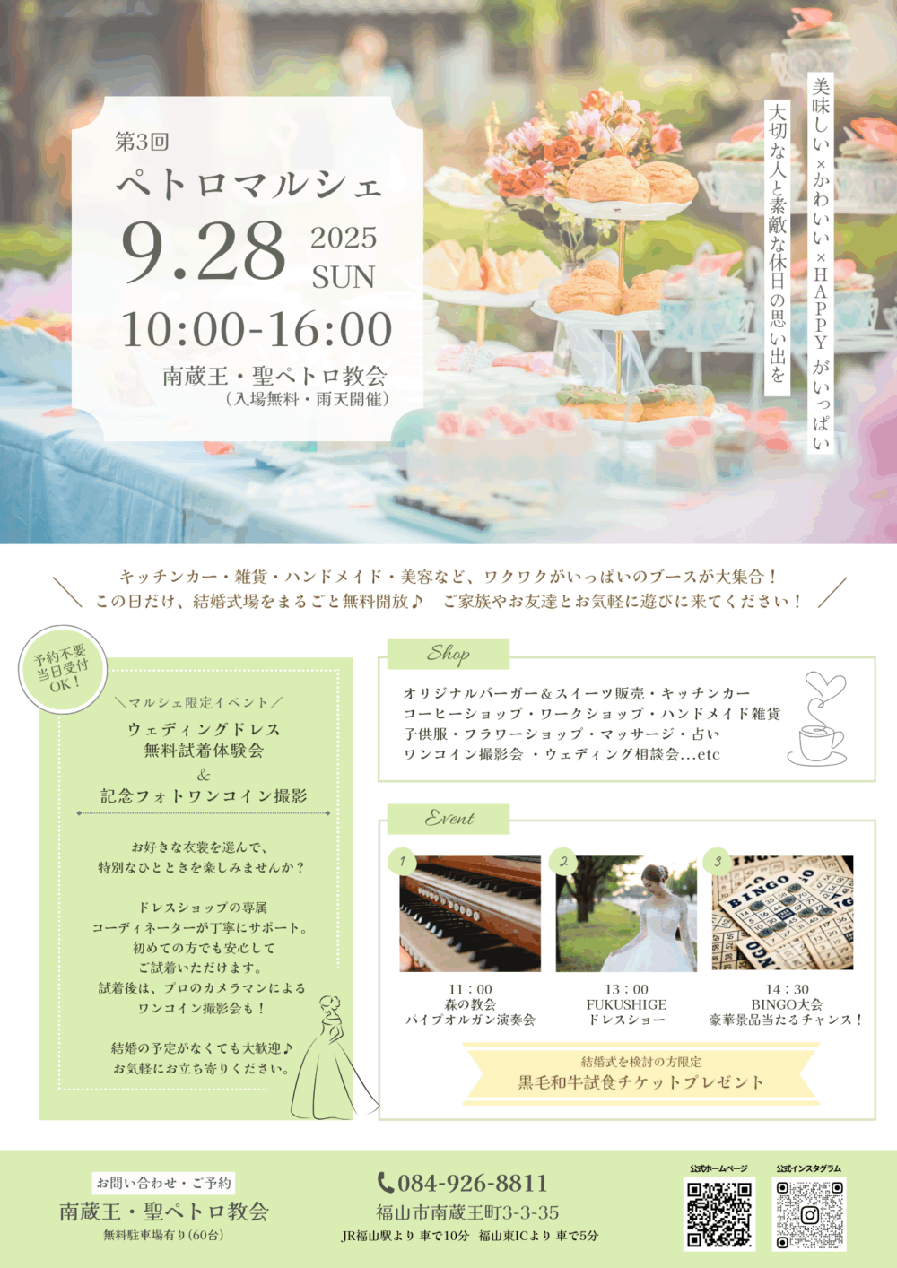 広島県福山市にある結婚式場 アニバーサリーガーデン南蔵王・聖ペトロ教会 にて、この度 第3回 ペトロマルシェ を開催することになりました♪