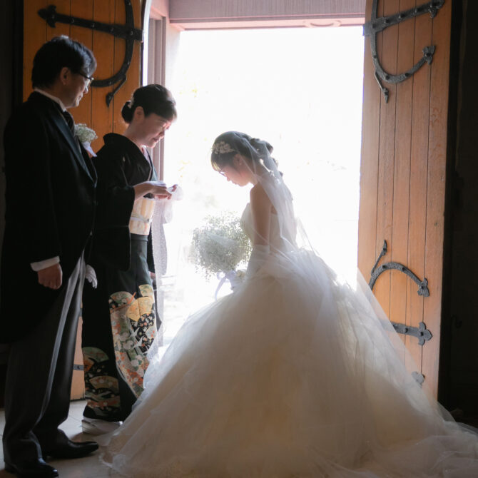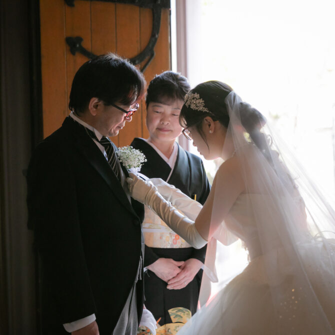 挙式だけにご参列頂くゲストも多い為、チャペルでご両親様がゲストの皆様へ感謝を伝えるため、お出迎えされました。ご兄弟様やご親族様、ご友人の方にも丁寧に挨拶をされていらっしゃいました。挙式直前には、おふたりへ最後の身支度を行いました。康二さんはジャケットを着せてもらい、送り出されました。香澄さんは、ヴァージンロードを共に歩まれるお父様へコサージュをお贈りになり、お母様からベールダウンを行って頂きご入場へ。