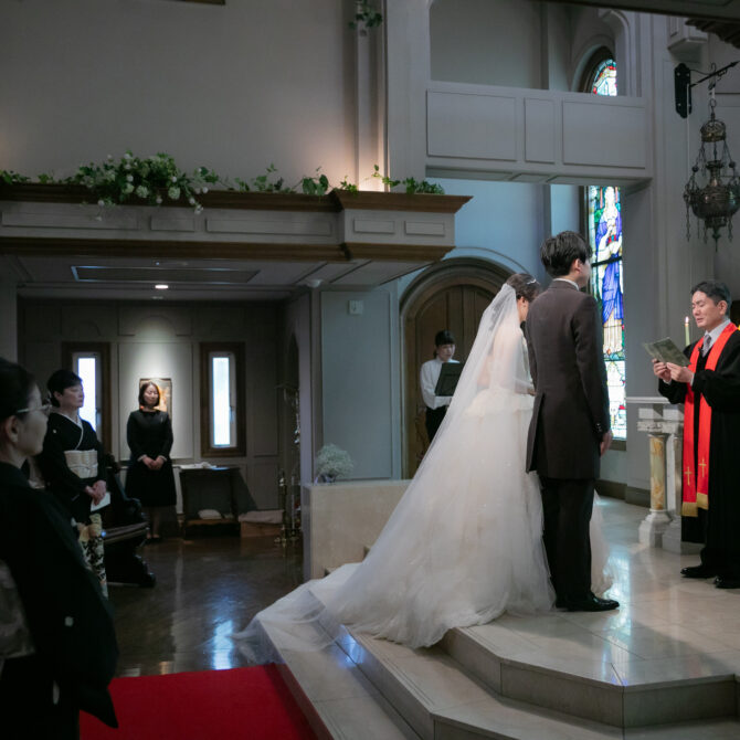 当時、この場所で新郎としてヴァージンロードを歩いたお父様が28年の時を経て今日、大切に育てて来られた香澄さんと一緒に歩んでいくお姿は、ご家族の歴史の1ページに携わらせて頂いていることを改めて実感し、とても感動的な瞬間でした。そして、ご両親様のご結婚式でも司式を務めた牧師からおふたりへ、祝福のお言葉が贈られました。おふたりが愛を誓ったのち、指輪の交換。香澄さんが今日のために頑張って手作りしたリングピローがとても素敵です!晴れてご夫婦となった康二さんと香澄さんは、皆様に見守られながら退場されました。