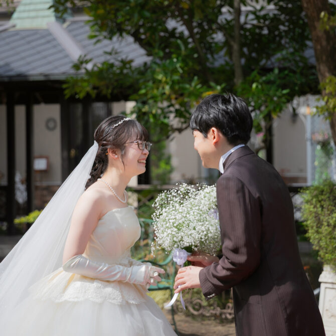 カスミ草のブーケを手に、康二さんはガーデンに向かわれ、これからおふたりだけのお時間“ファーストミート”へ。香澄さんとご対面したときは、おふたりともが満面の笑みで写真から幸せオーラが溢れているほど、とても素敵な瞬間でした。