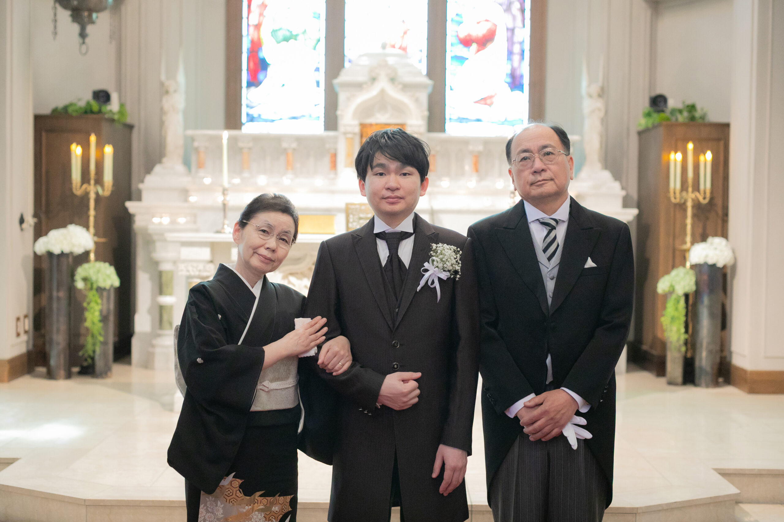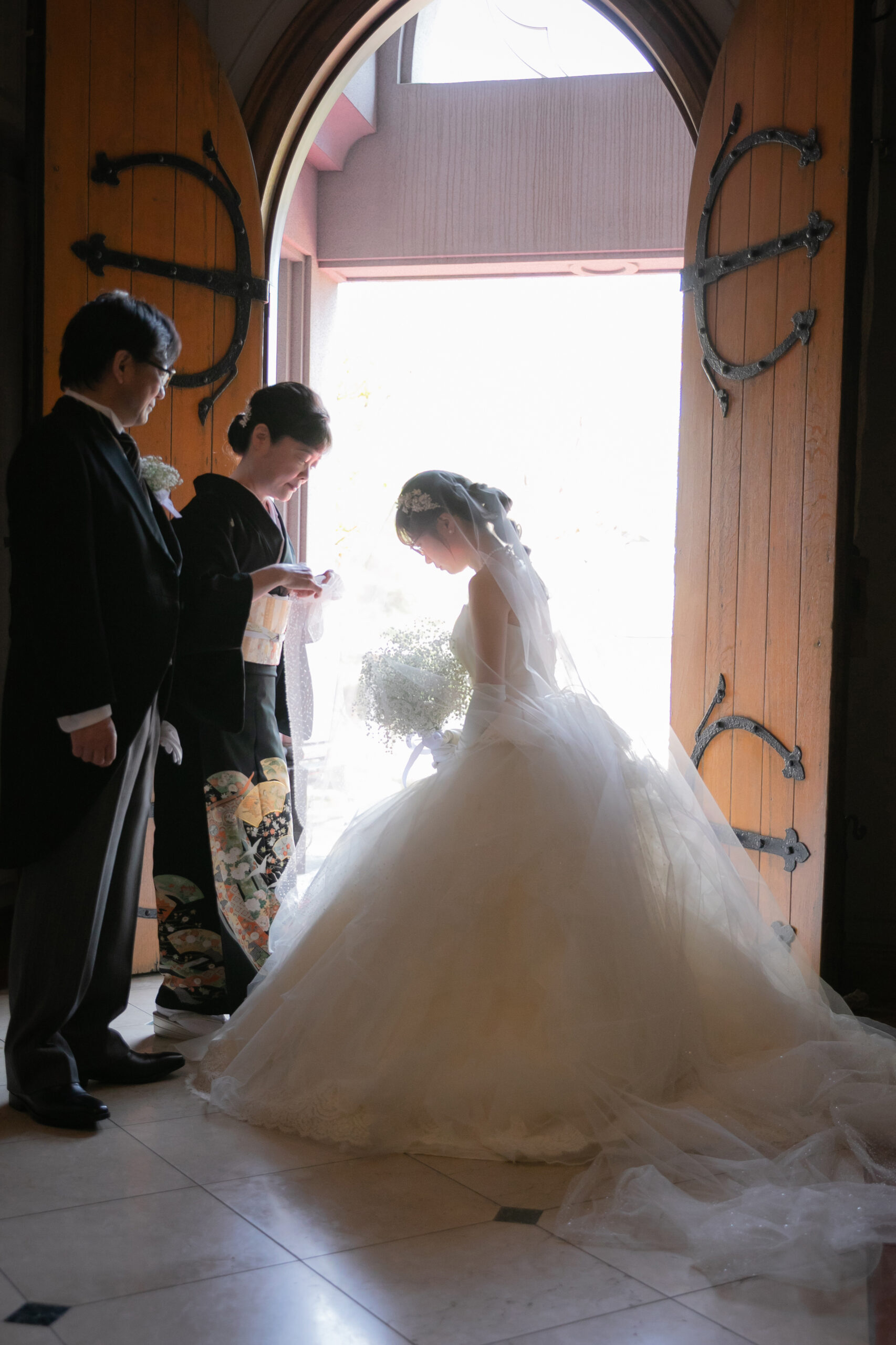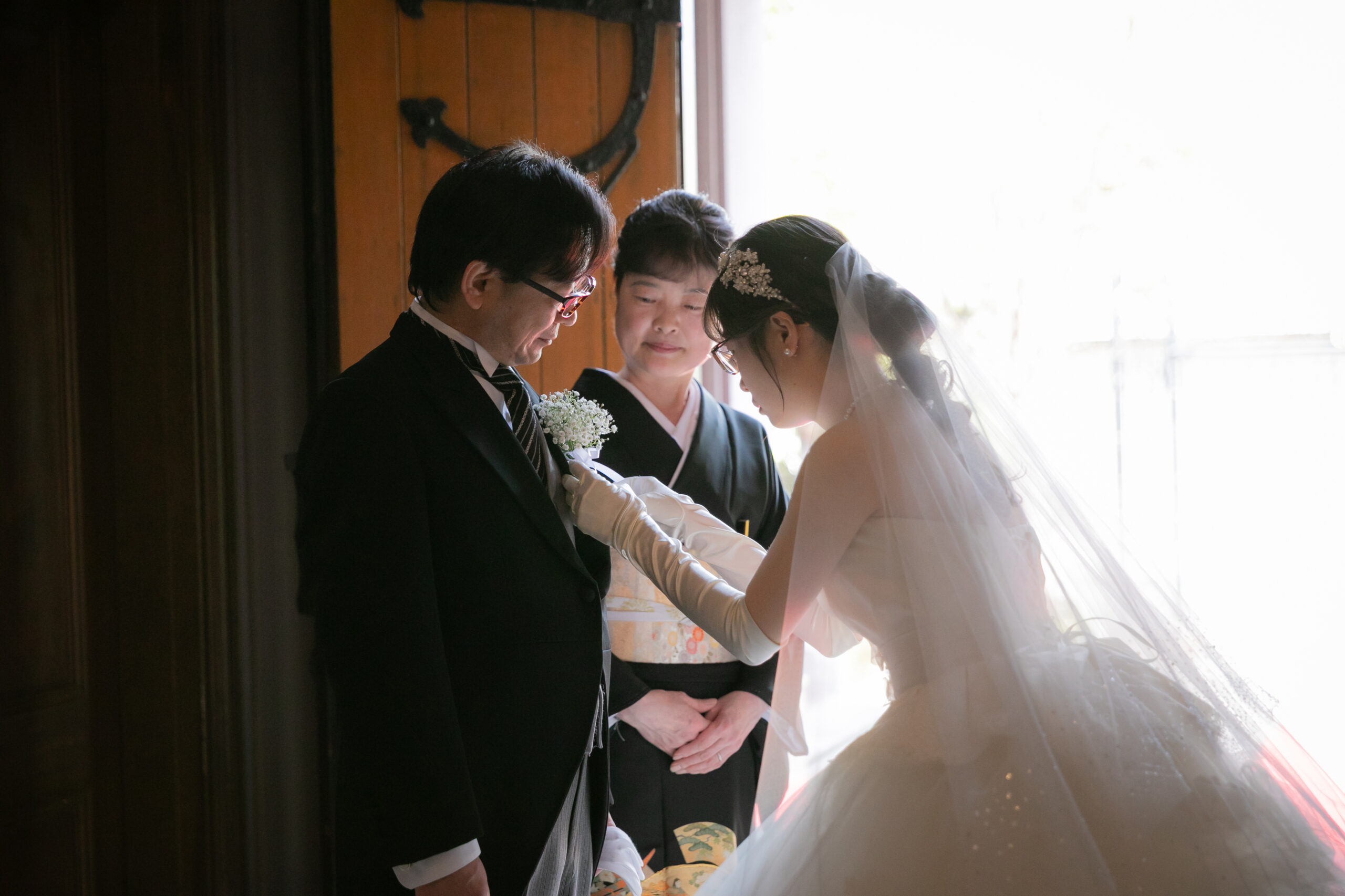 挙式だけにご参列頂くゲストも多い為、チャペルでご両親様がゲストの皆様へ感謝を伝えるため、お出迎えされました。ご兄弟様やご親族様、ご友人の方にも丁寧に挨拶をされていらっしゃいました。挙式直前には、おふたりへ最後の身支度を行いました。康二さんはジャケットを着せてもらい、送り出されました。香澄さんは、ヴァージンロードを共に歩まれるお父様へコサージュをお贈りになり、お母様からベールダウンを行って頂きご入場へ。