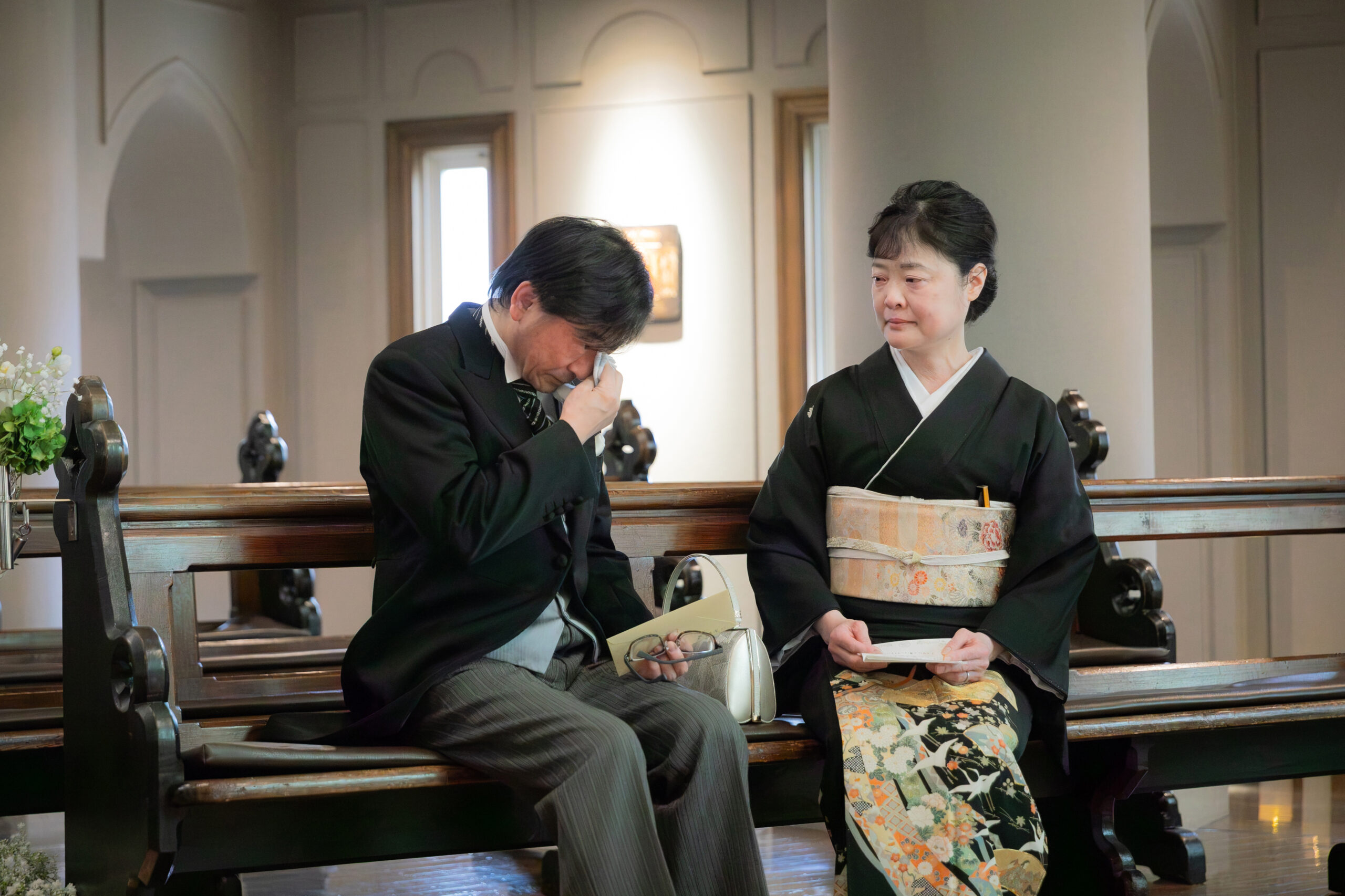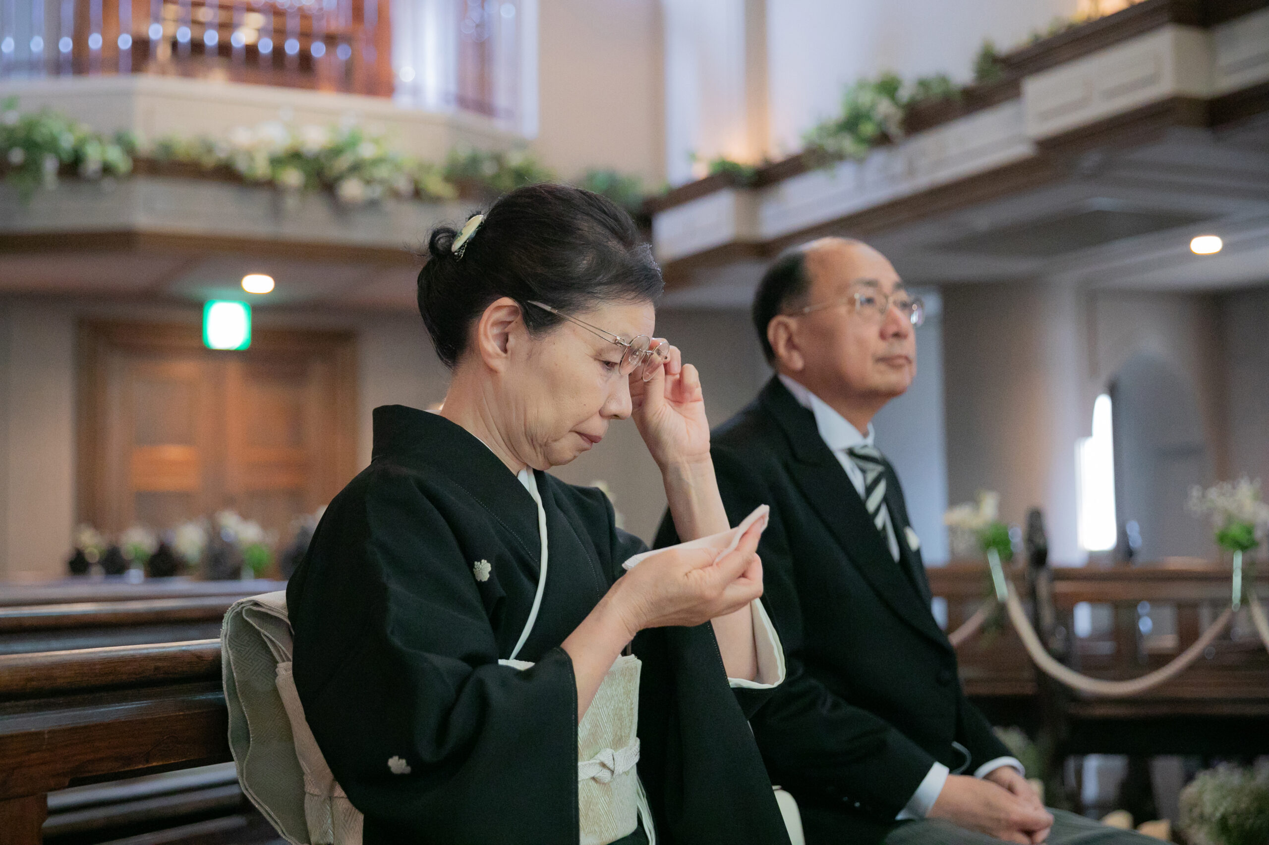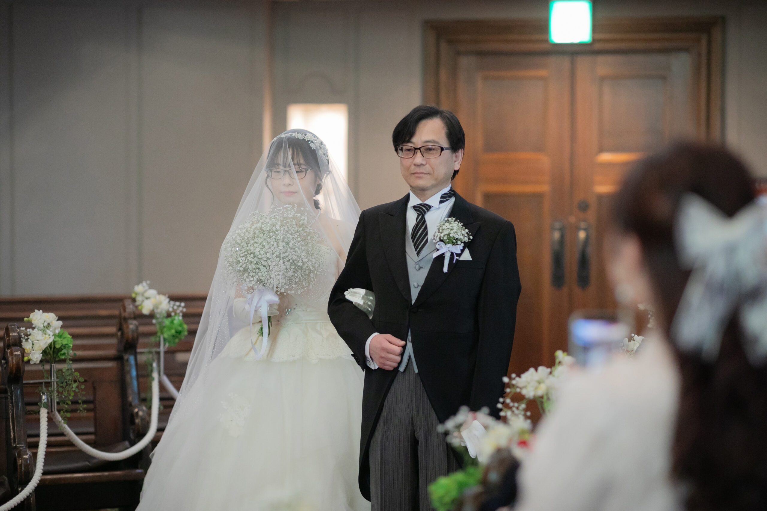 挙式だけにご参列頂くゲストも多い為、チャペルでご両親様がゲストの皆様へ感謝を伝えるため、お出迎えされました。ご兄弟様やご親族様、ご友人の方にも丁寧に挨拶をされていらっしゃいました。挙式直前には、おふたりへ最後の身支度を行いました。康二さんはジャケットを着せてもらい、送り出されました。香澄さんは、ヴァージンロードを共に歩まれるお父様へコサージュをお贈りになり、お母様からベールダウンを行って頂きご入場へ。