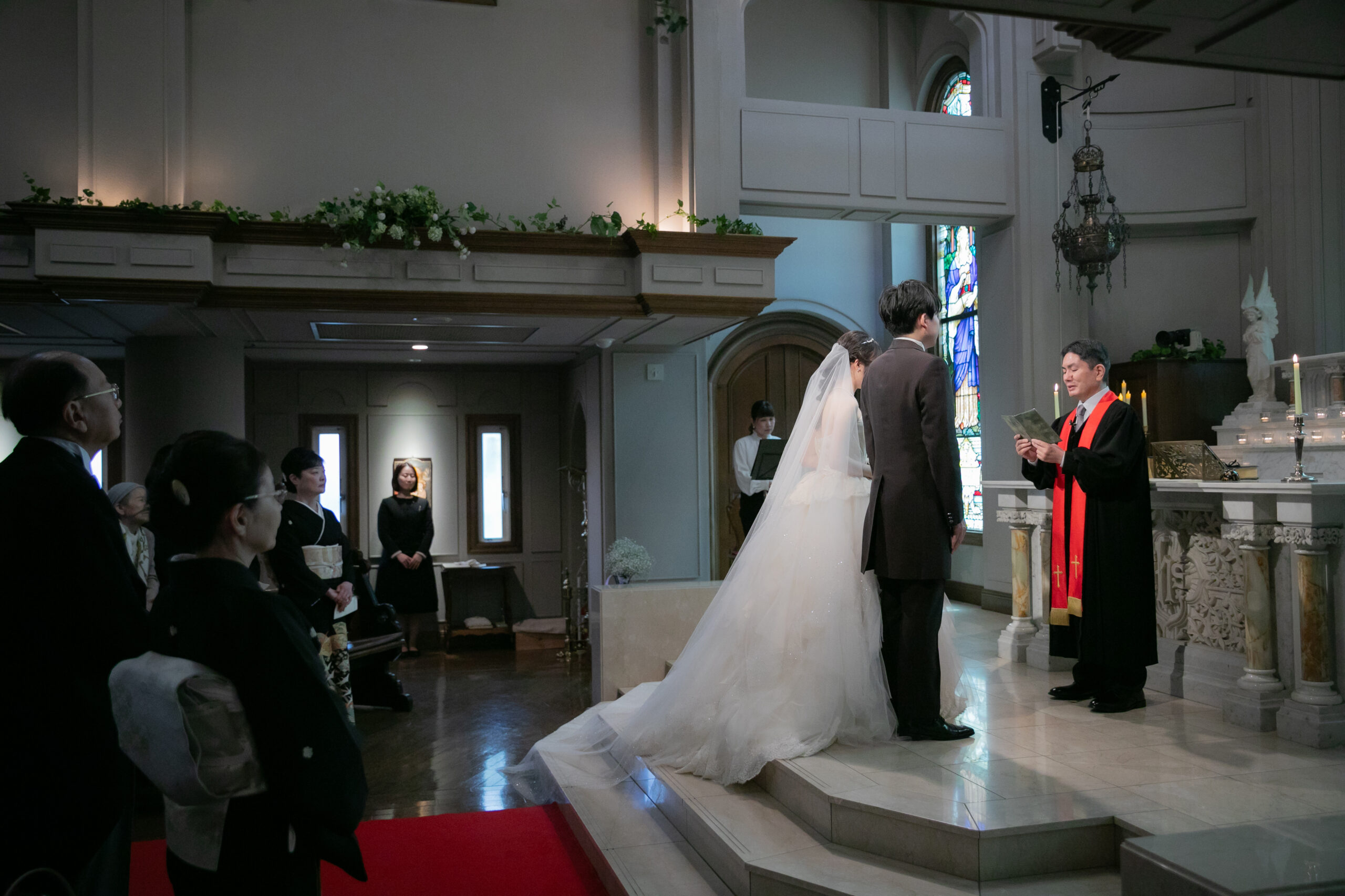 当時、この場所で新郎としてヴァージンロードを歩いたお父様が28年の時を経て今日、大切に育てて来られた香澄さんと一緒に歩んでいくお姿は、ご家族の歴史の1ページに携わらせて頂いていることを改めて実感し、とても感動的な瞬間でした。そして、ご両親様のご結婚式でも司式を務めた牧師からおふたりへ、祝福のお言葉が贈られました。おふたりが愛を誓ったのち、指輪の交換。香澄さんが今日のために頑張って手作りしたリングピローがとても素敵です!晴れてご夫婦となった康二さんと香澄さんは、皆様に見守られながら退場されました。