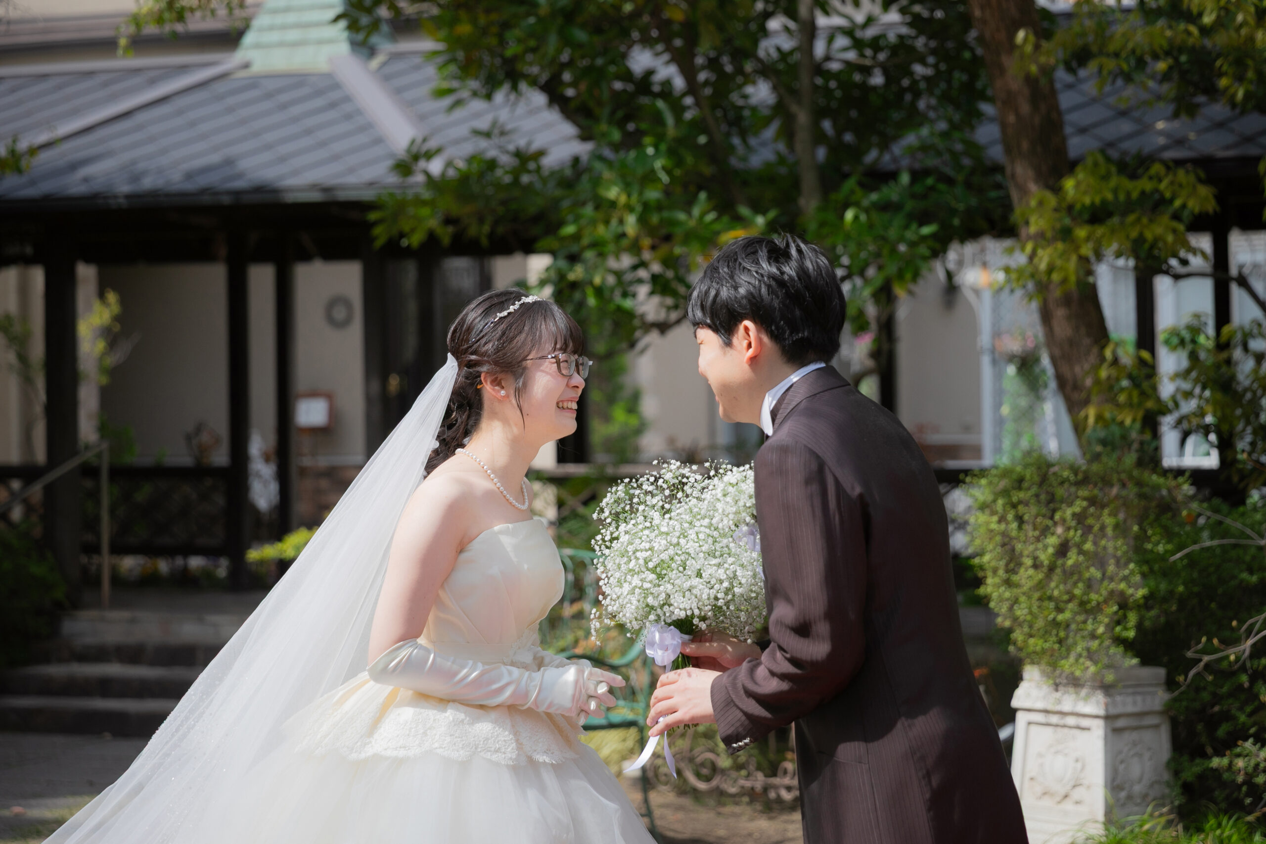 カスミ草のブーケを手に、康二さんはガーデンに向かわれ、これからおふたりだけのお時間“ファーストミート”へ。香澄さんとご対面したときは、おふたりともが満面の笑みで写真から幸せオーラが溢れているほど、とても素敵な瞬間でした。