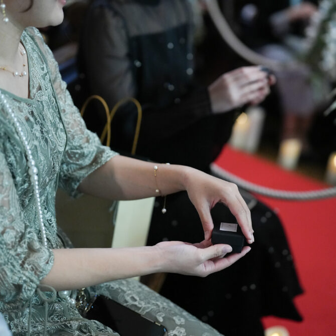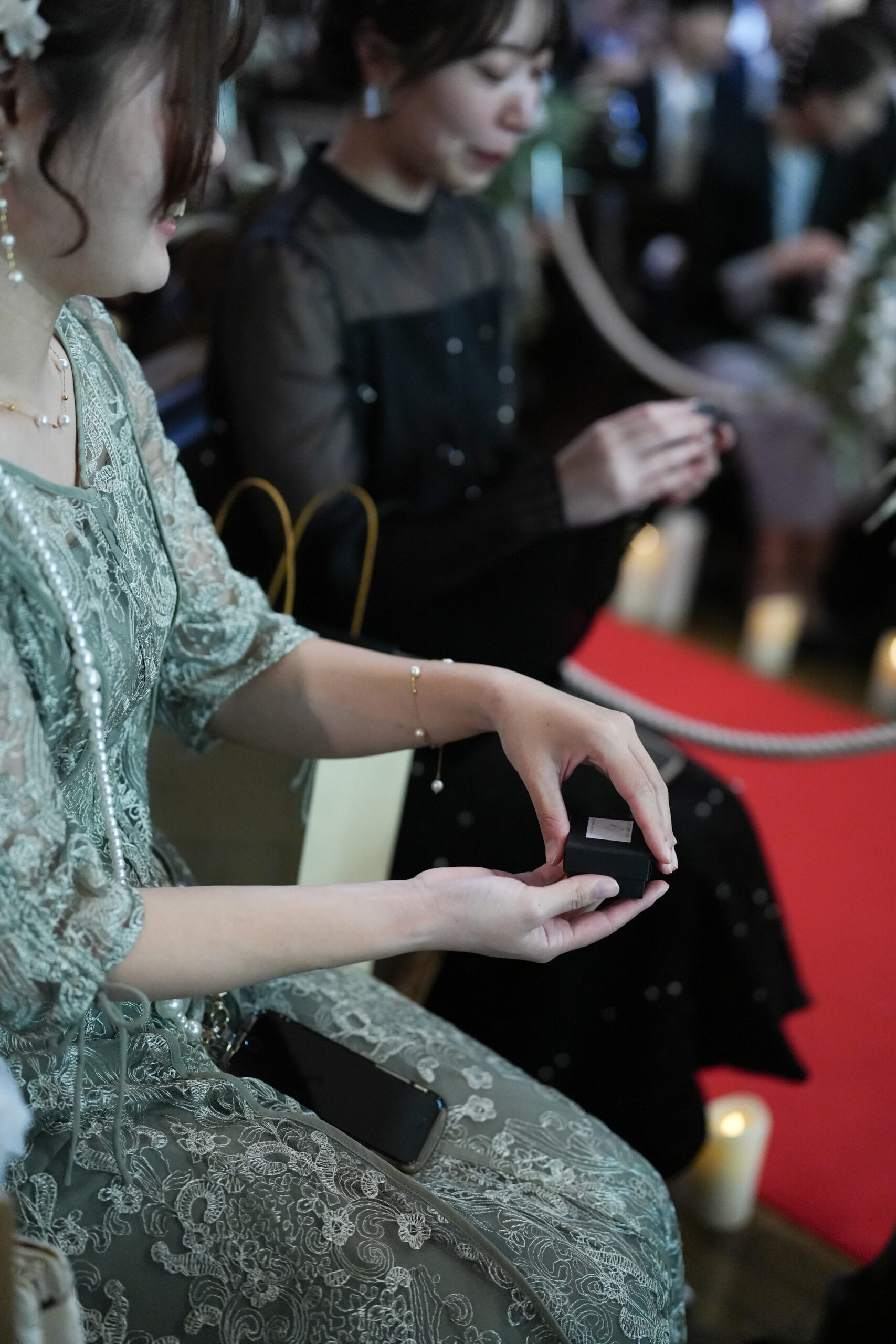 人前式では、ゲスト参加型のリングBOXセレモニーを。会場中が笑顔と拍手に包まれ、おふたりらしい和やかな挙式となりました。
