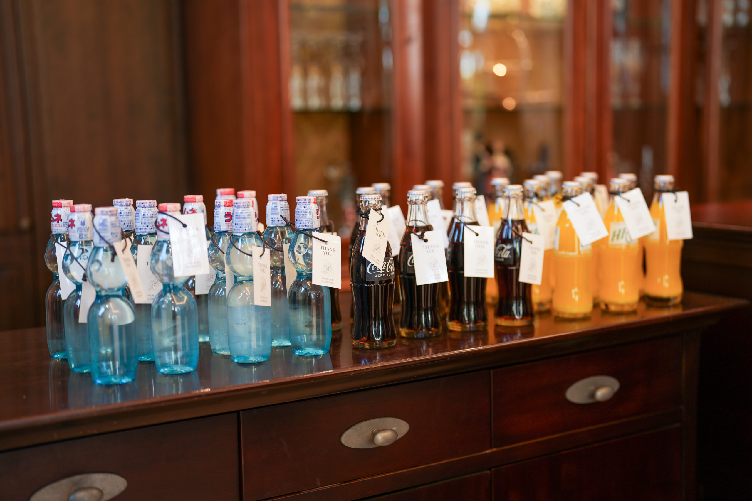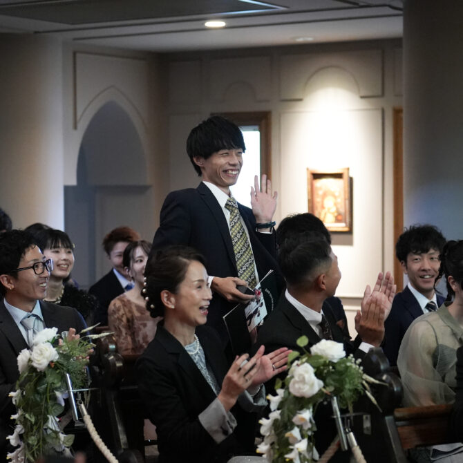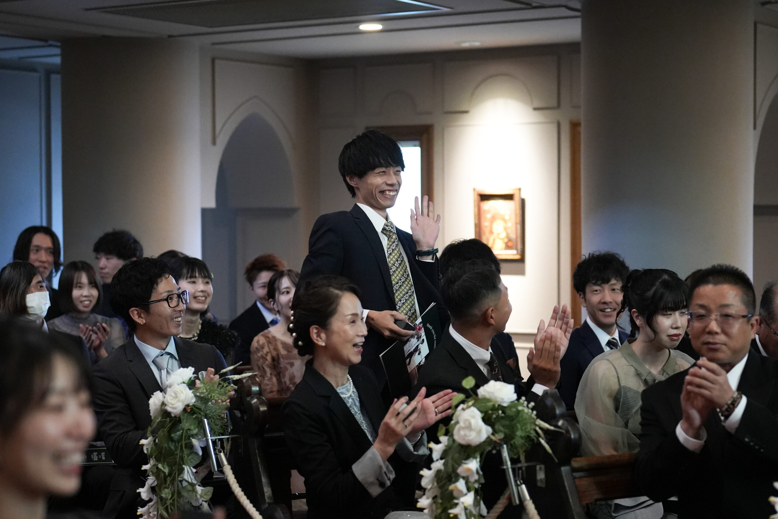 新郎謝辞では、おふたりの結婚式を誰よりも楽しみにしてくれていた大切な存在への想いが語られ、まっすぐな言葉に、会場はあたたかな空気に包まれました。 プチギフトは、選べる瓶ジュース。 「どれにしよう?」とわいわい会話を楽しみながらのお見送りとなりました。 二次会もそのままペトロ教会にて。 時間に追われることなく、のんびりとゆっくり、余韻を味わいながら過ごしていただきました。この日の笑顔が、これからのおふたりの日常をそっと照らし続けてくれますように。