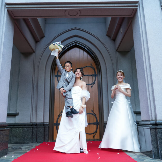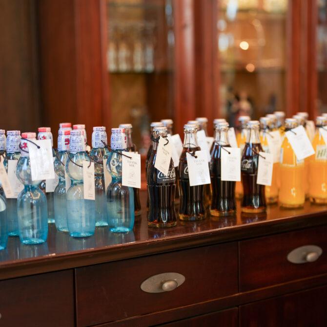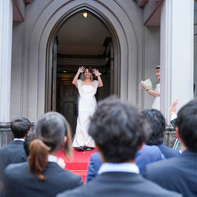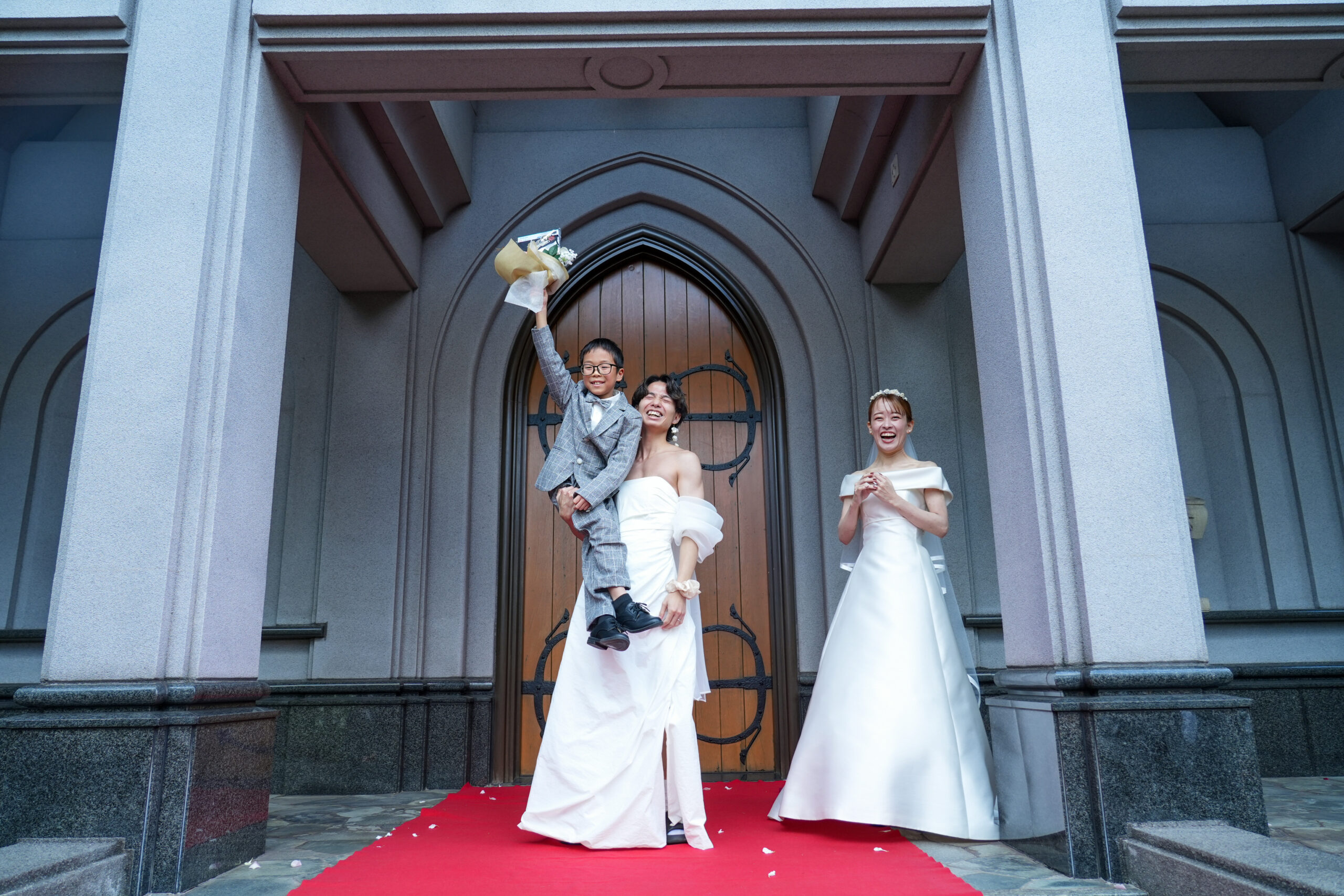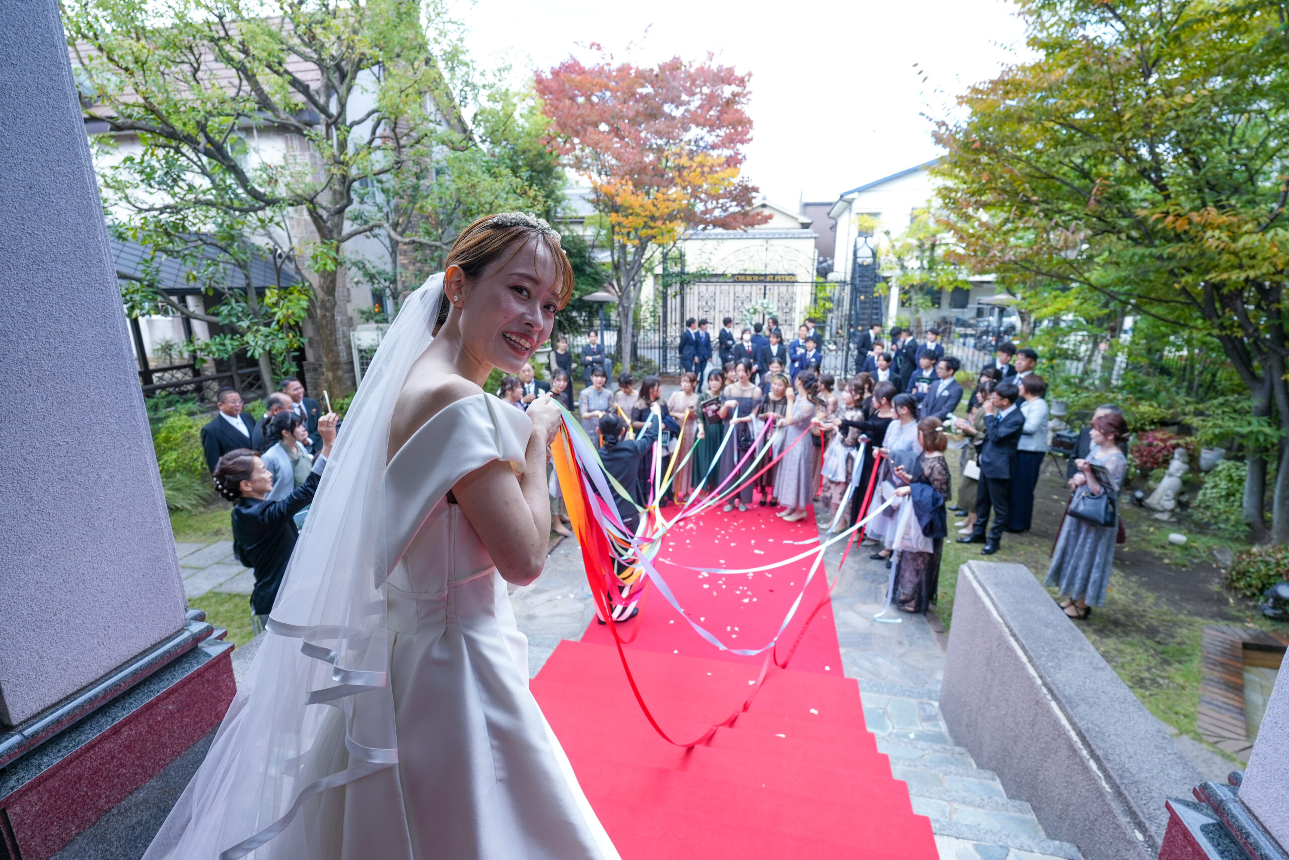 新郎謝辞では、おふたりの結婚式を誰よりも楽しみにしてくれていた大切な存在への想いが語られ、まっすぐな言葉に、会場はあたたかな空気に包まれました。 プチギフトは、選べる瓶ジュース。 「どれにしよう?」とわいわい会話を楽しみながらのお見送りとなりました。 二次会もそのままペトロ教会にて。 時間に追われることなく、のんびりとゆっくり、余韻を味わいながら過ごしていただきました。この日の笑顔が、これからのおふたりの日常をそっと照らし続けてくれますように。