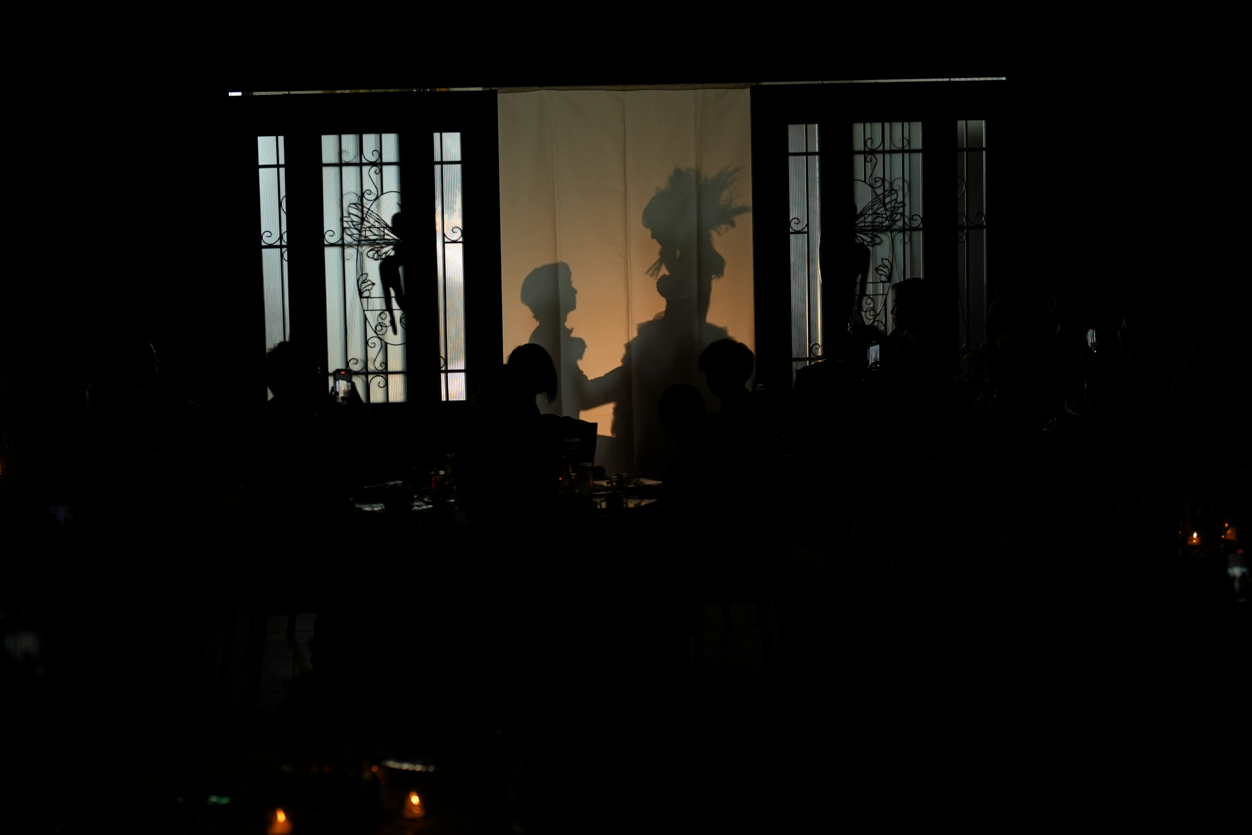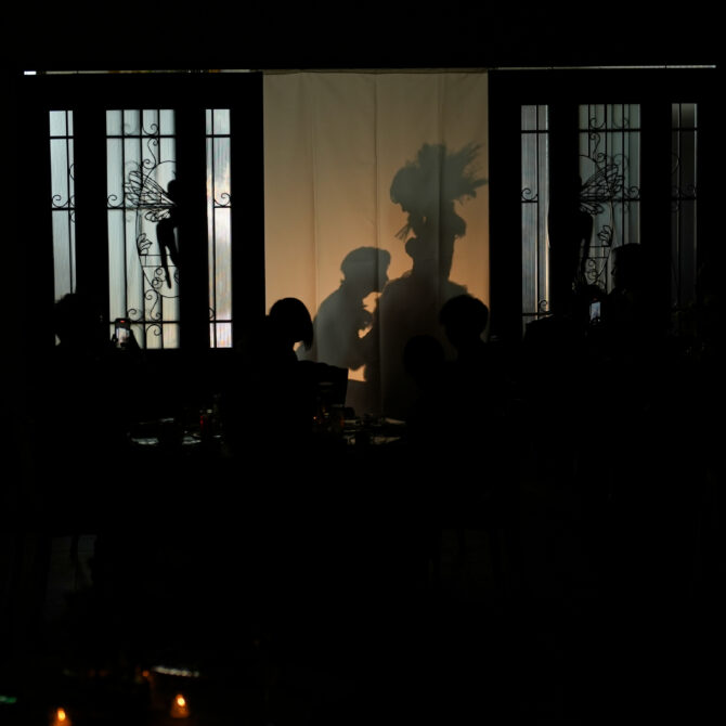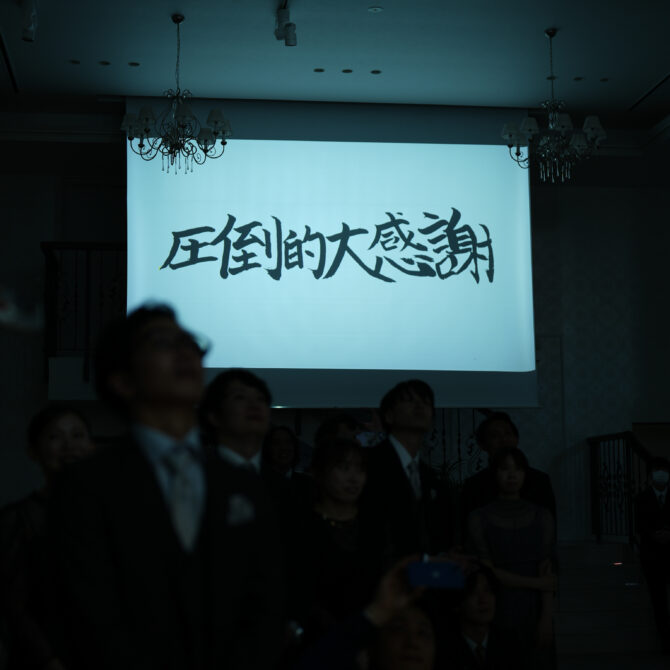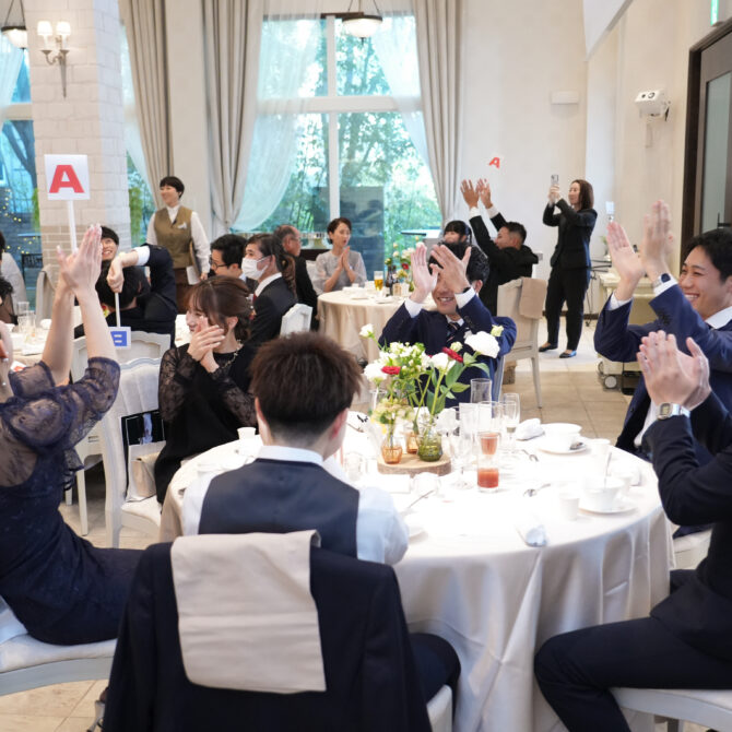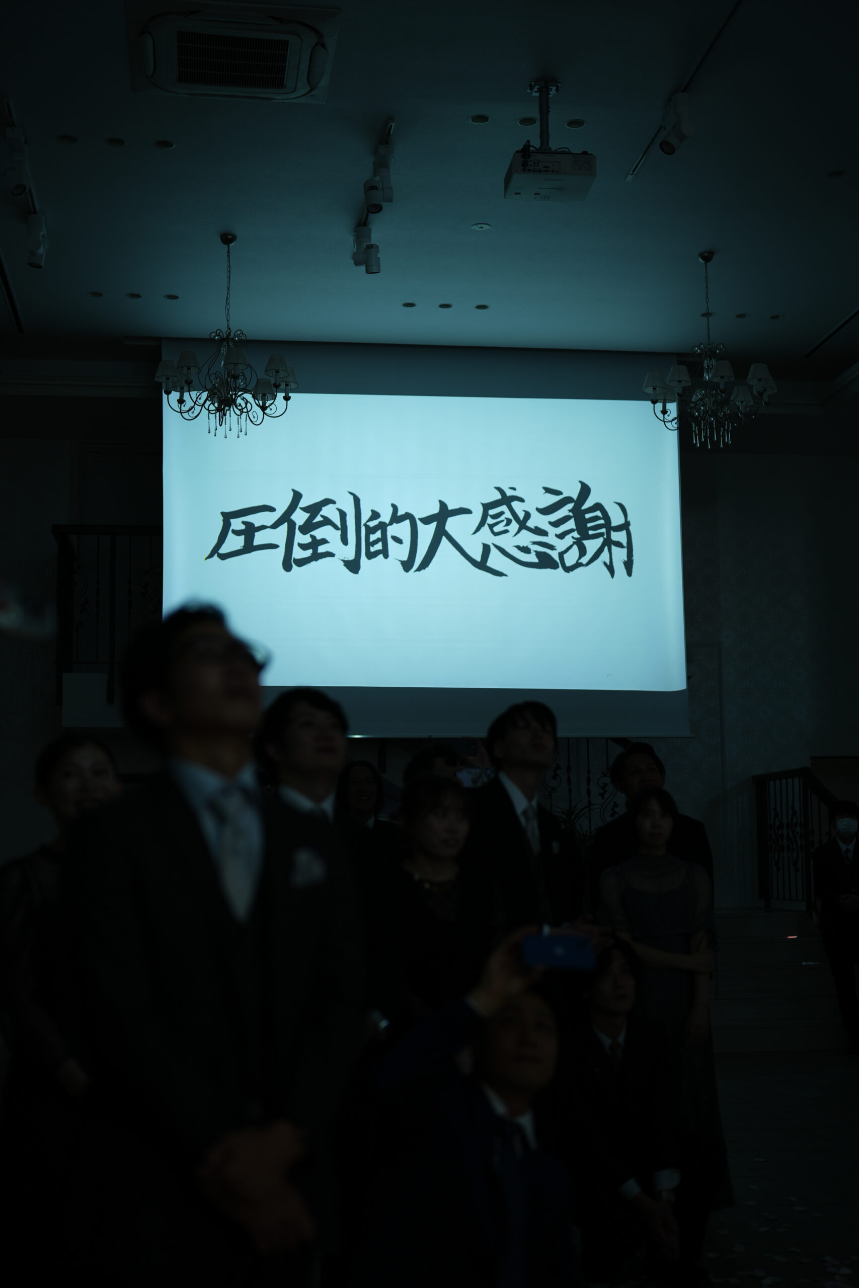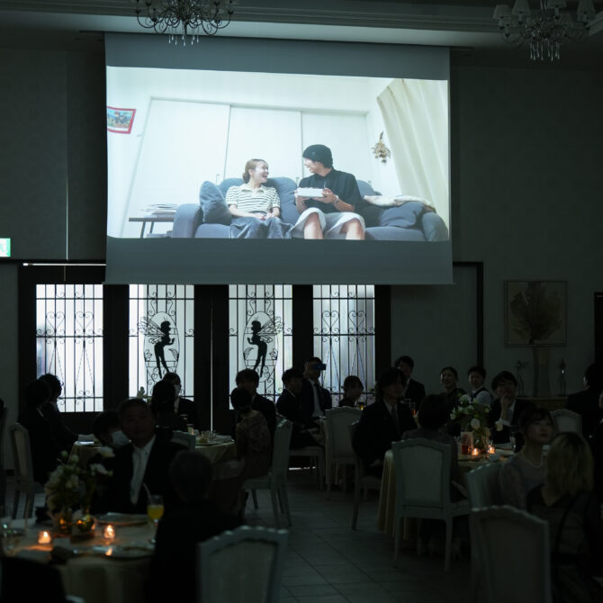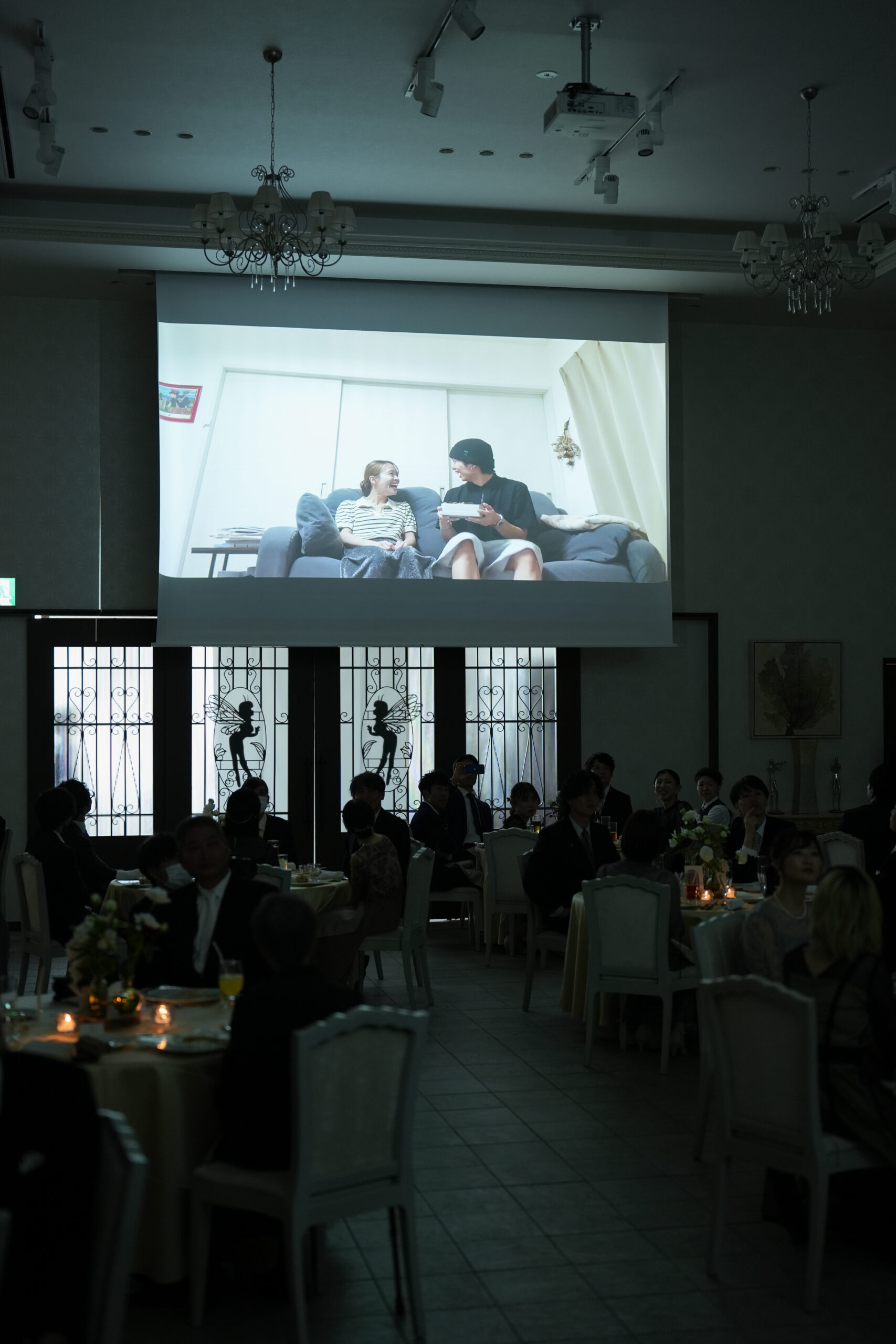 披露宴では、生い立ちムービーで家族が増えることが発表されるサプライズも。続くシルエット入場で再登場したおふたりを、会場中が祝福の拍手で包み込みました。