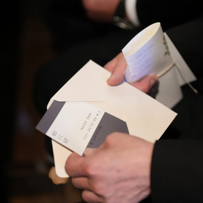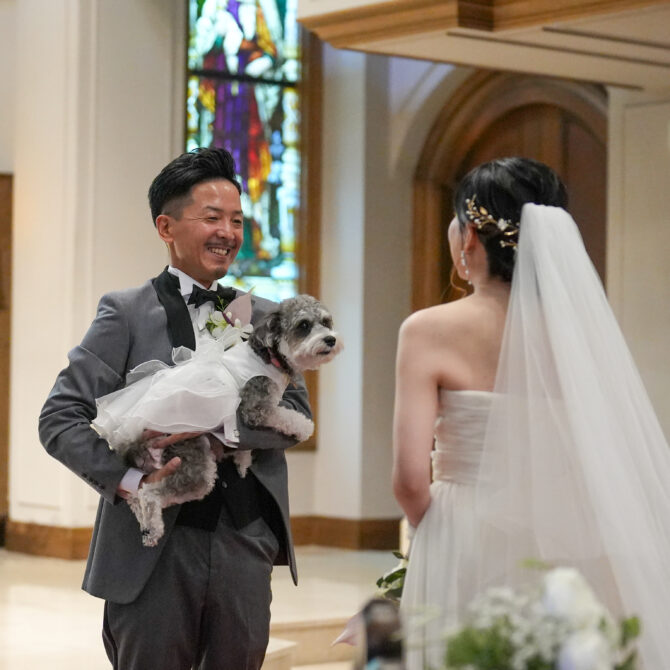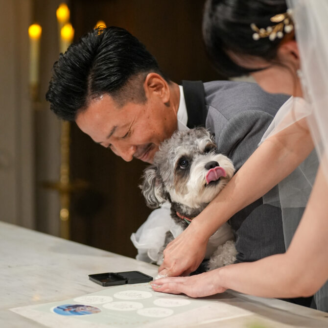 人前式では、ゲストお一人おひとりへ宛てたスイッチングレターを。形式にとらわれず、想いをまっすぐ届けられる人前式は、おふたりにぴったりでした。愛犬のおとちゃんも、リングドッグや結婚証明書で大活躍!
