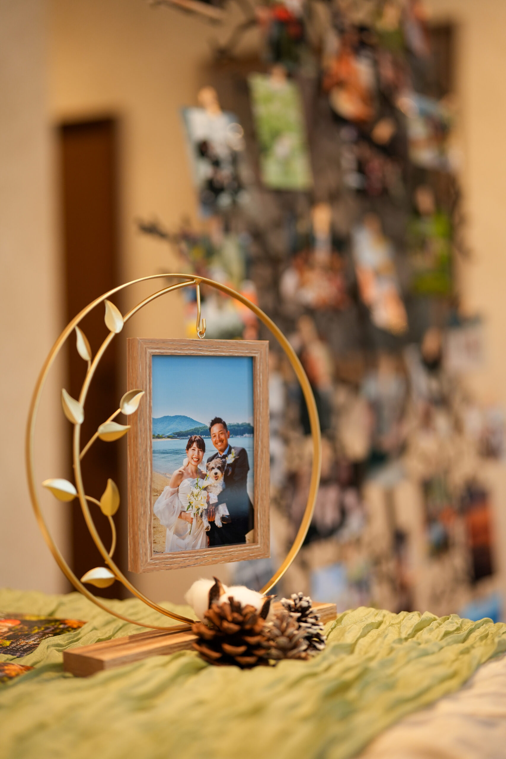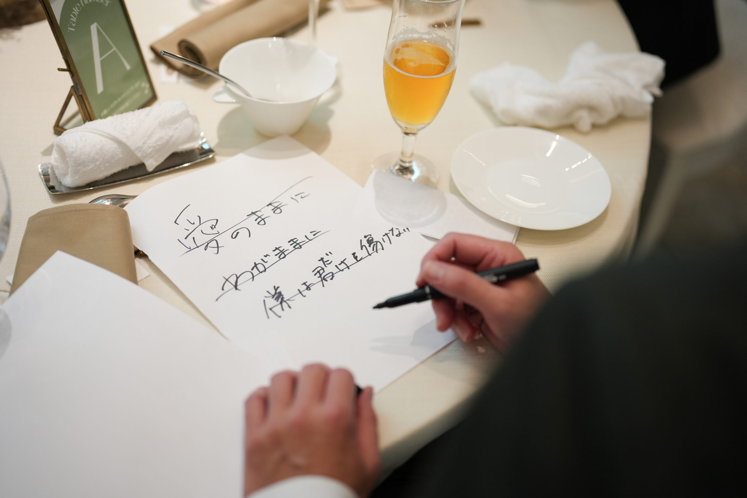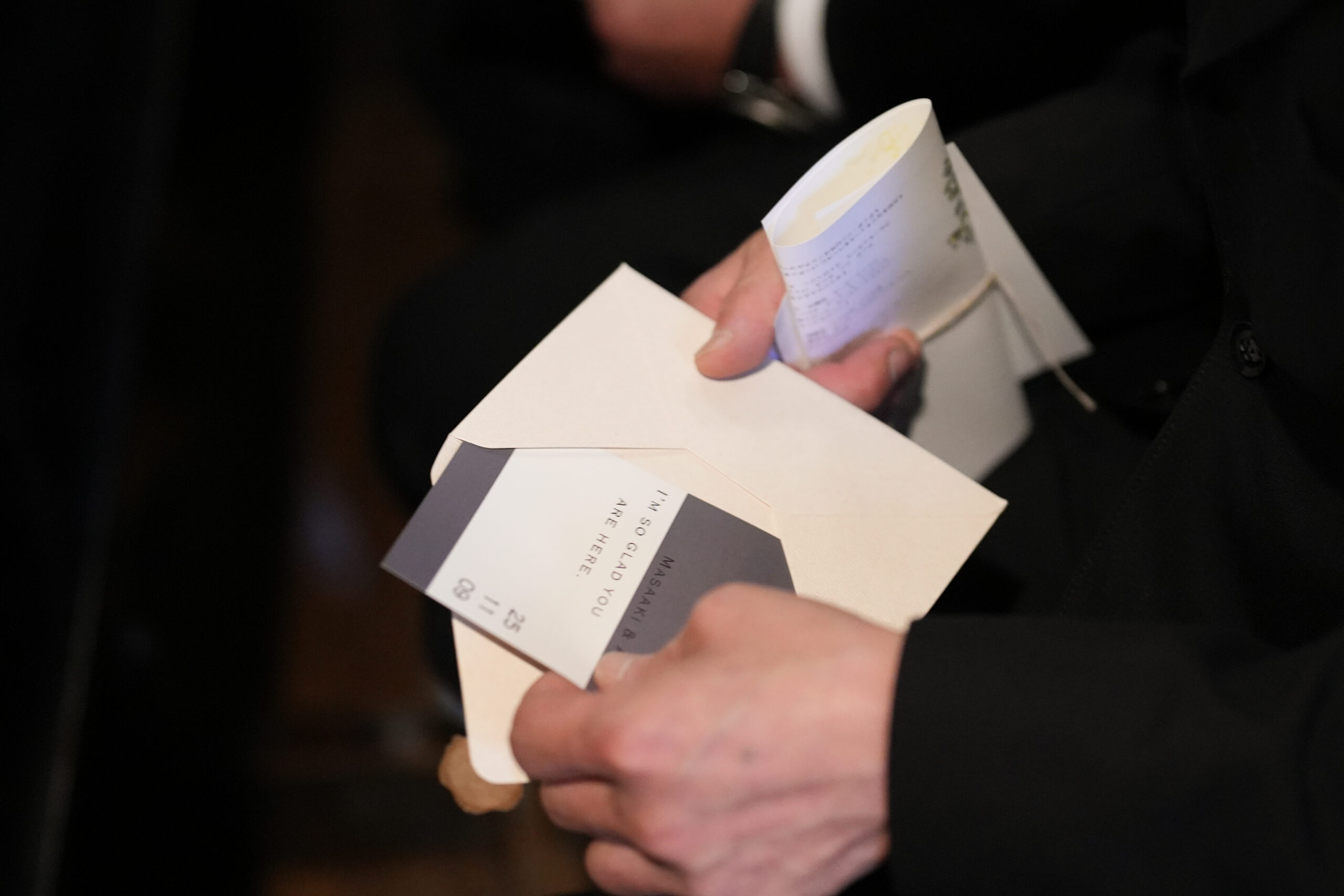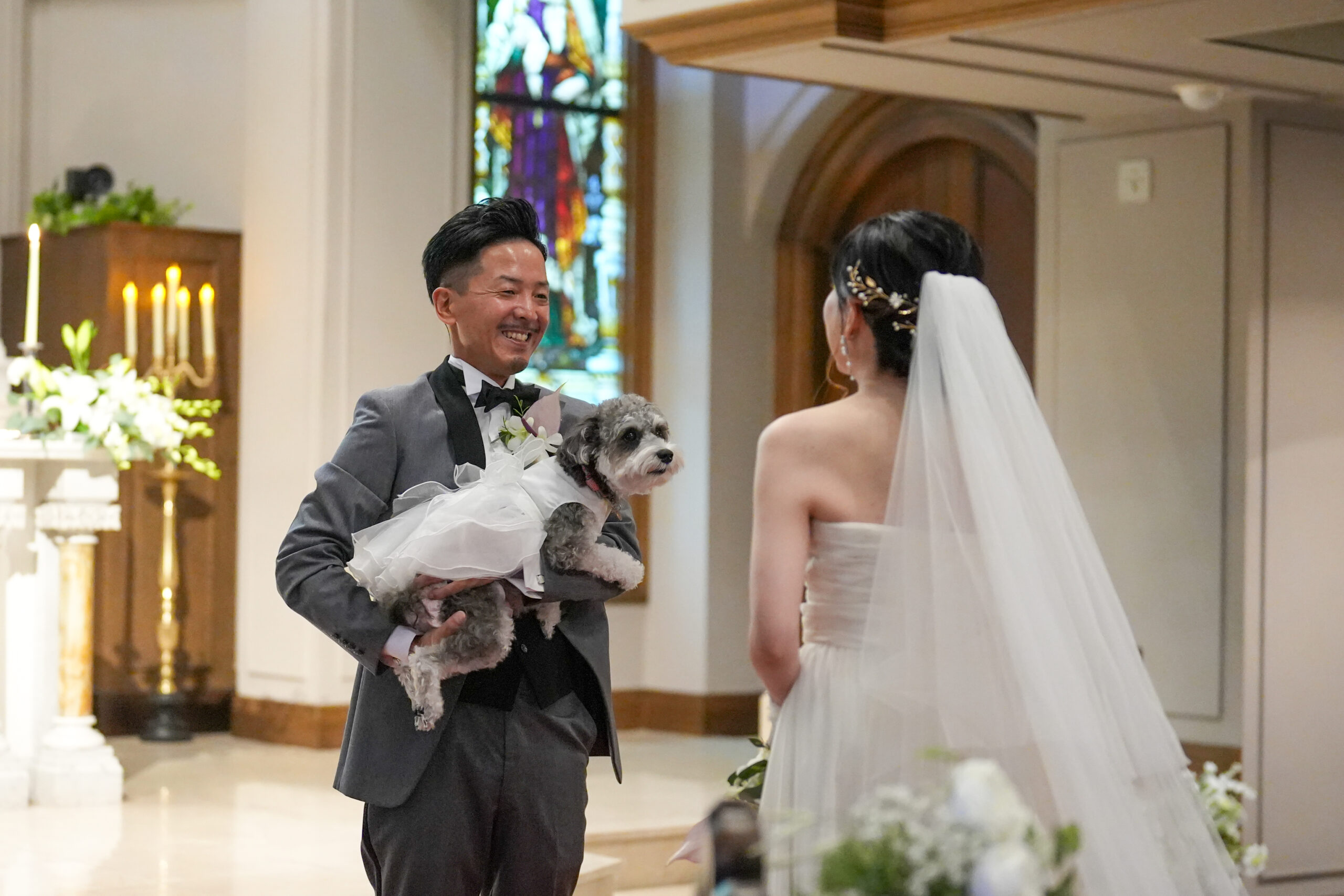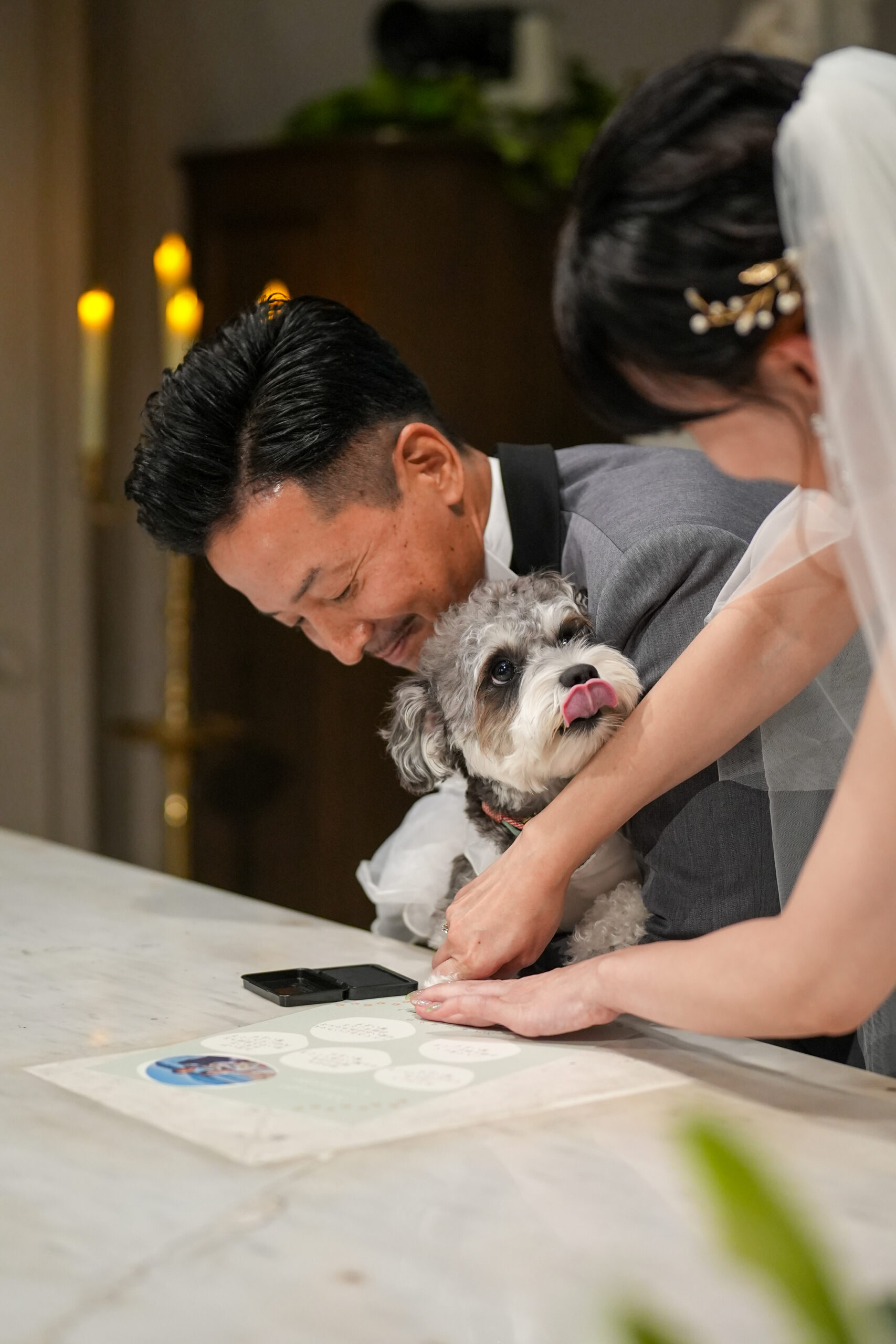 人前式では、ゲストお一人おひとりへ宛てたスイッチングレターを。形式にとらわれず、想いをまっすぐ届けられる人前式は、おふたりにぴったりでした。愛犬のおとちゃんも、リングドッグや結婚証明書で大活躍!
