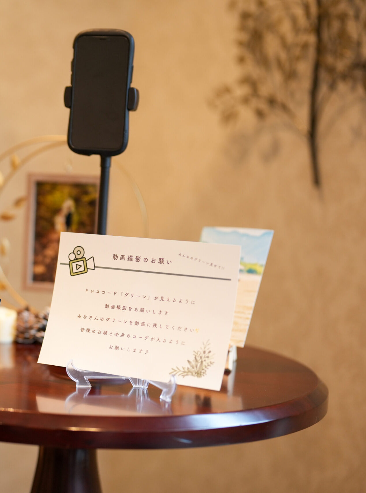 家族との食事会後、挙式スタイルに装いを新たにされたおふたり。挙式を行うチャペルでファミリーミートを行い、お披露目です。ドレスコードは“緑”。ゲストの皆様が思い思いのグリーンコーディネートで集まり、会場は笑顔と彩りに包まれました。