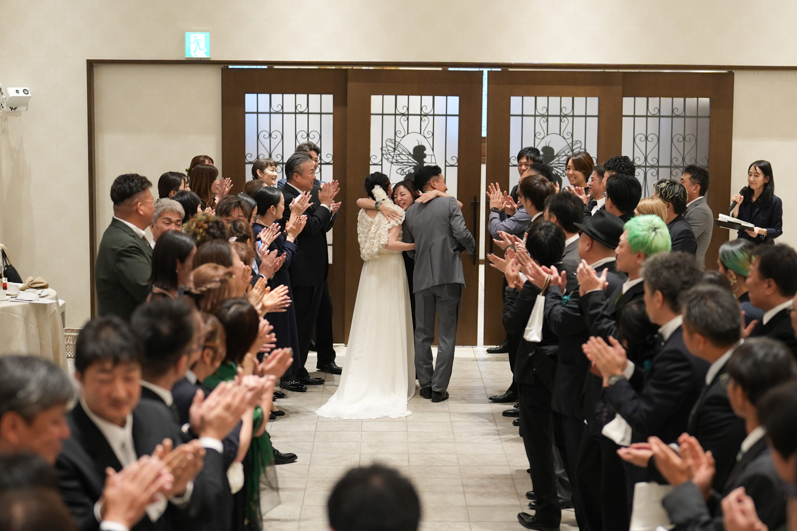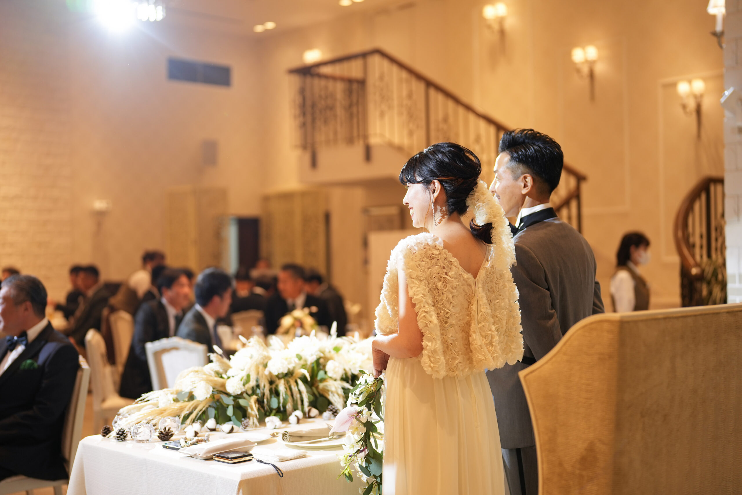 当日は、ご家族とのあたたかな食事会からスタート。その後ご友人が合流し、人前結婚式、そしてパーティへと続く二部制ウェディングでお届けしました。ご家族との時間をゆったりと過ごした後、祝福の輪が広がっていく進行は、世代を問わず人気のスタイル。それぞれの時間を大切にできる構成は、1日1組貸切だからこそ叶い、“今までの人生”と“これからの人生”をつなぐ一日にもぴったりでした。