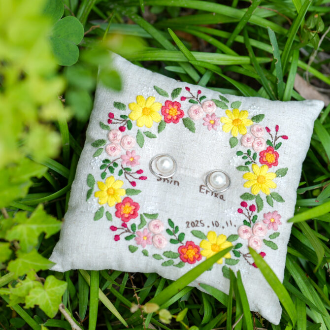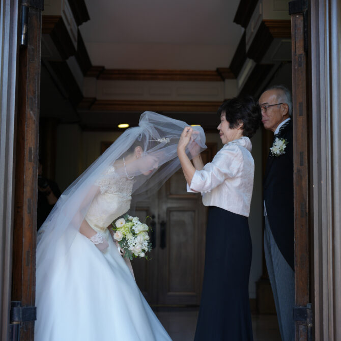 リングピローは、 恵理香さんの義叔母様が心を込めて手作りされました❁挙式の前には、親御様から最後の身支度を整えていただき、おふたりは挙式へと進まれました。