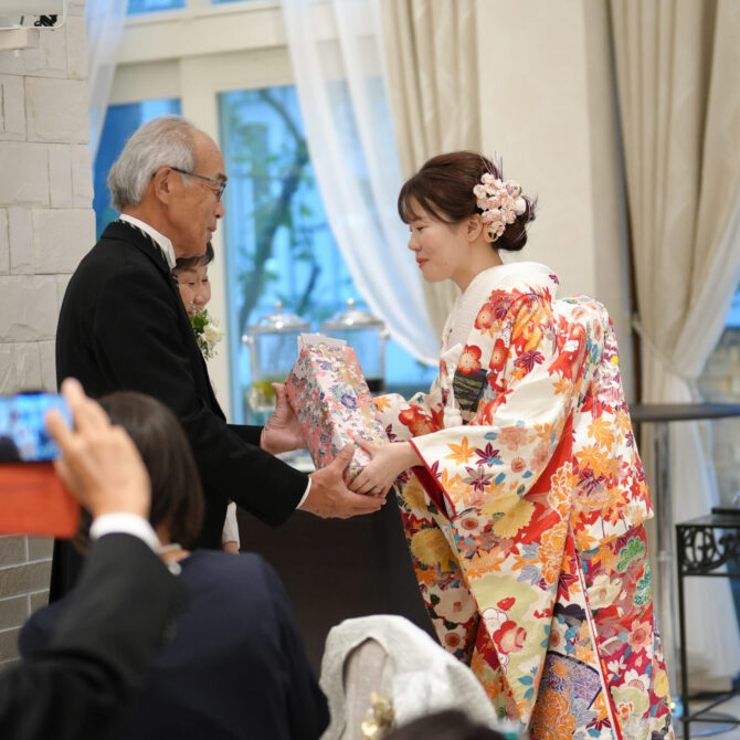 結びでは、記念品贈呈で鏡割りを行いました。樽の中からは、おふたりが生まれた年のワインが登場。これまで大切に育ててくれた親御様へ、感謝の気持ちを込めて贈られました。