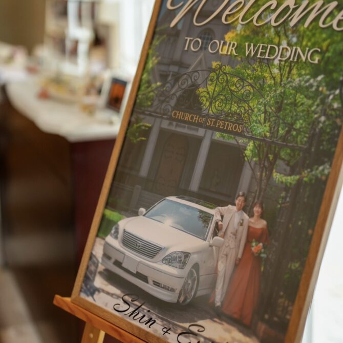 入口には、真さんの愛車が飾られゲストの皆さんを迎え入れました。また、ウェルカムスペースには、前撮りのカラードレス姿のお写真や温泉にちなんだのれんや桶などの温泉グッズを飾りましたね♪