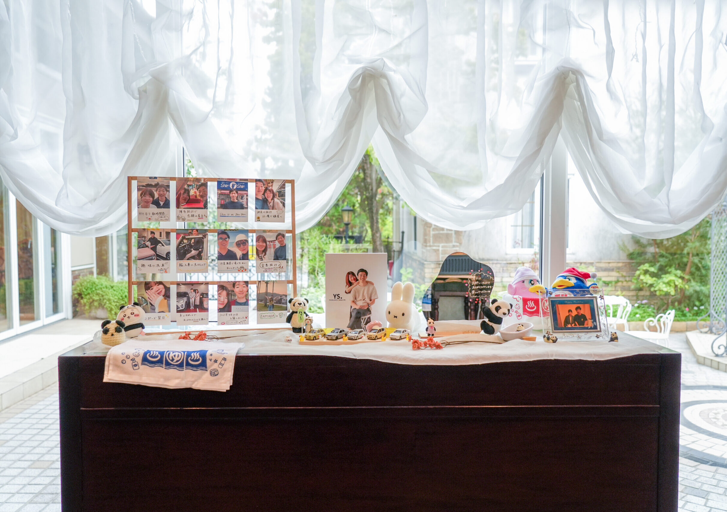 入口には、真さんの愛車が飾られゲストの皆さんを迎え入れました。また、ウェルカムスペースには、前撮りのカラードレス姿のお写真や温泉にちなんだのれんや桶などの温泉グッズを飾りましたね♪