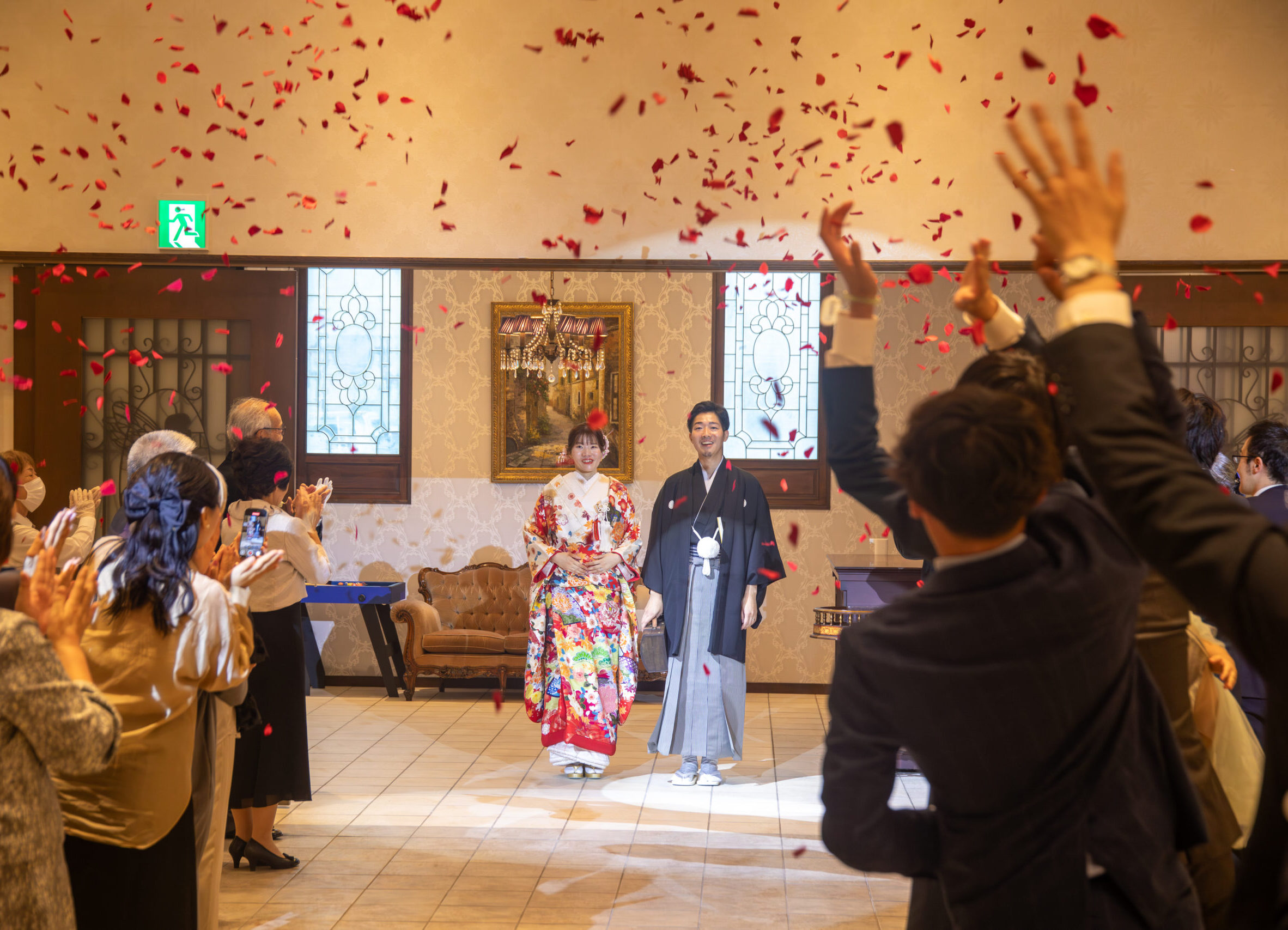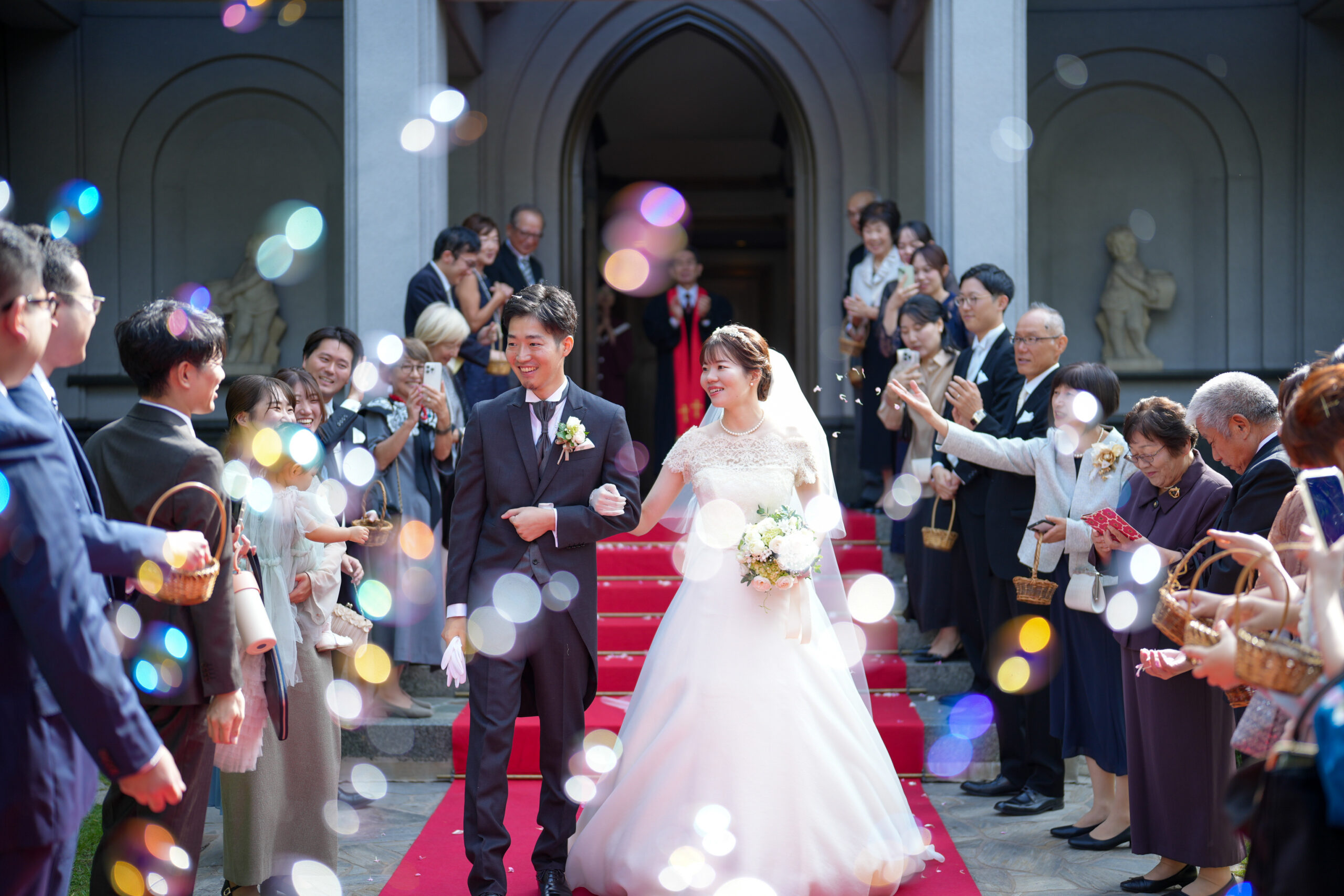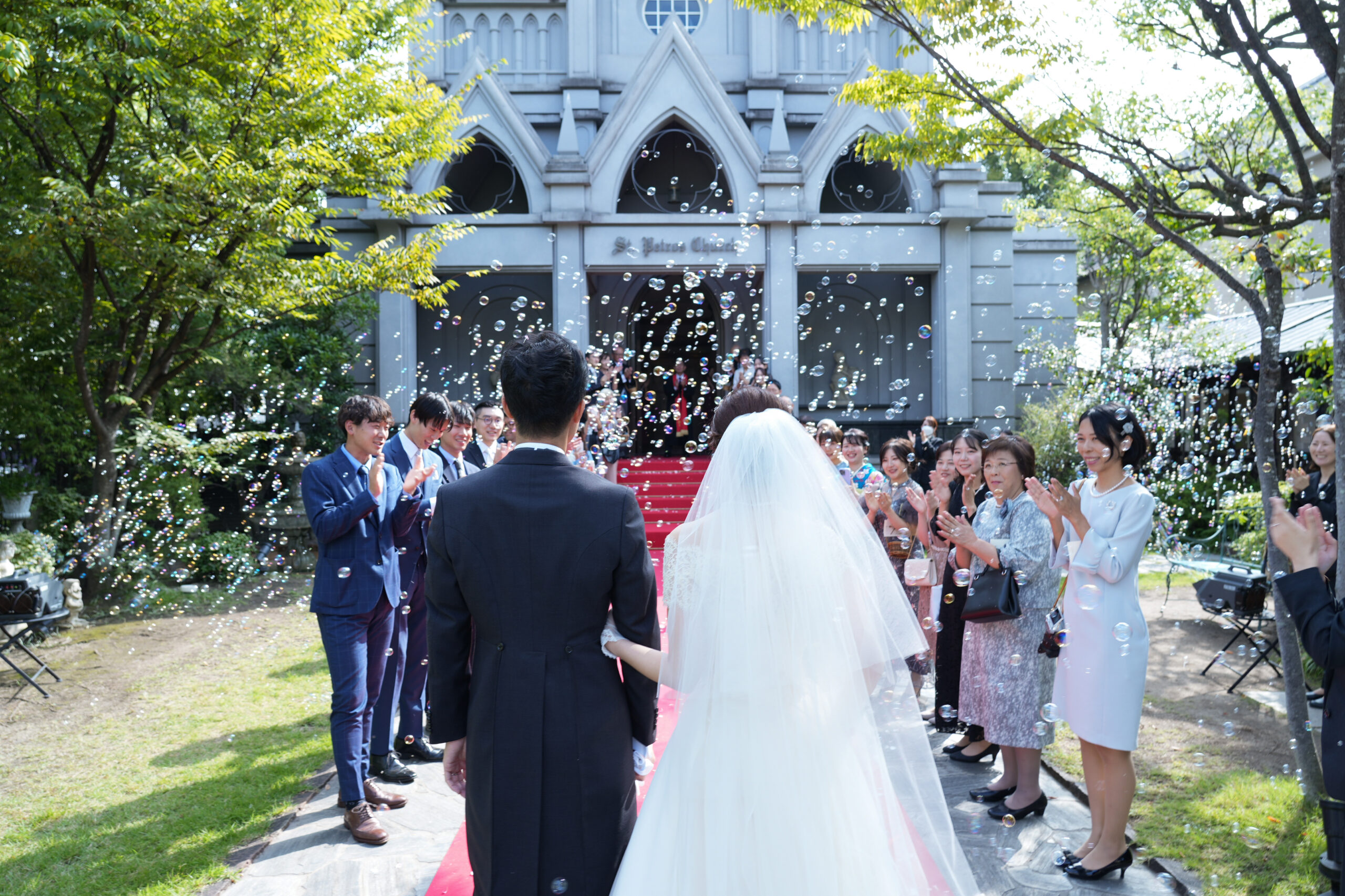 挙式後は、シャボン玉とゲストの温かい祝福の拍手に包まれながら、ご退場されました。