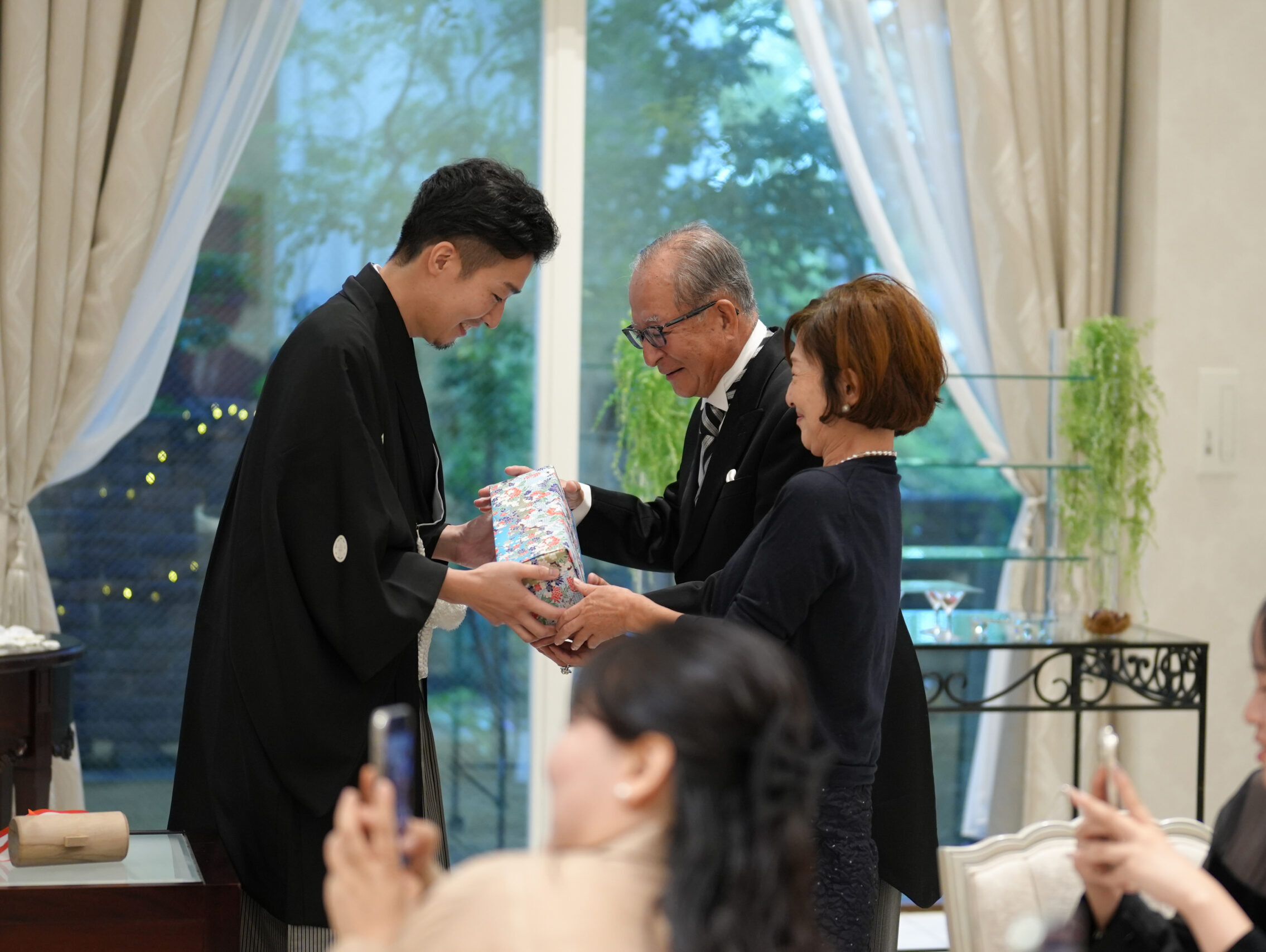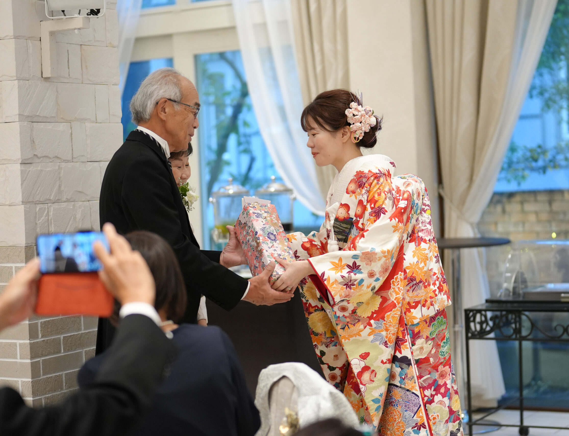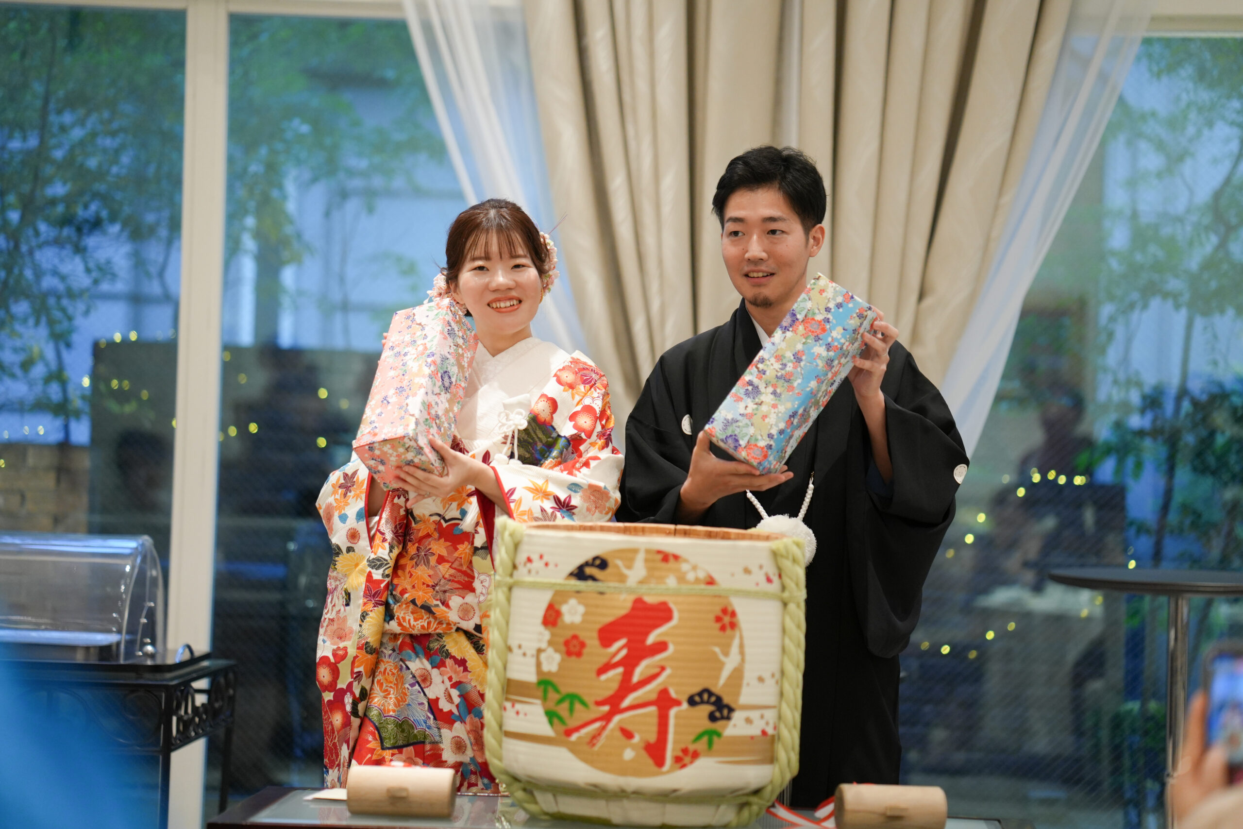 結びでは、記念品贈呈で鏡割りを行いました。樽の中からは、おふたりが生まれた年のワインが登場。これまで大切に育ててくれた親御様へ、感謝の気持ちを込めて贈られました。