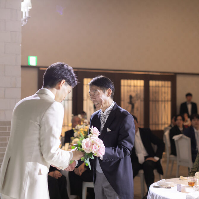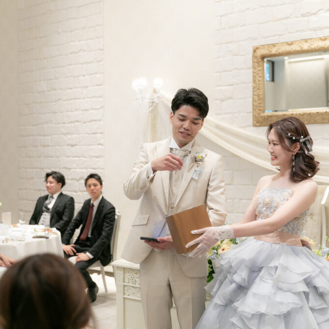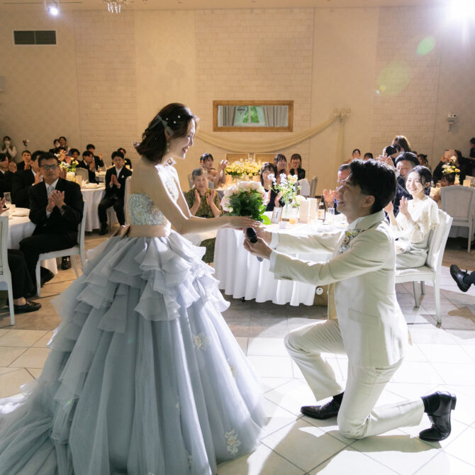 突然のサプライズに驚きながらも、思わず笑みがこぼれる新婦様。会場はあたたかい拍手と祝福に包まれ、おふたりの愛がより深く、鮮やかに輝いたひとときとなりました。
