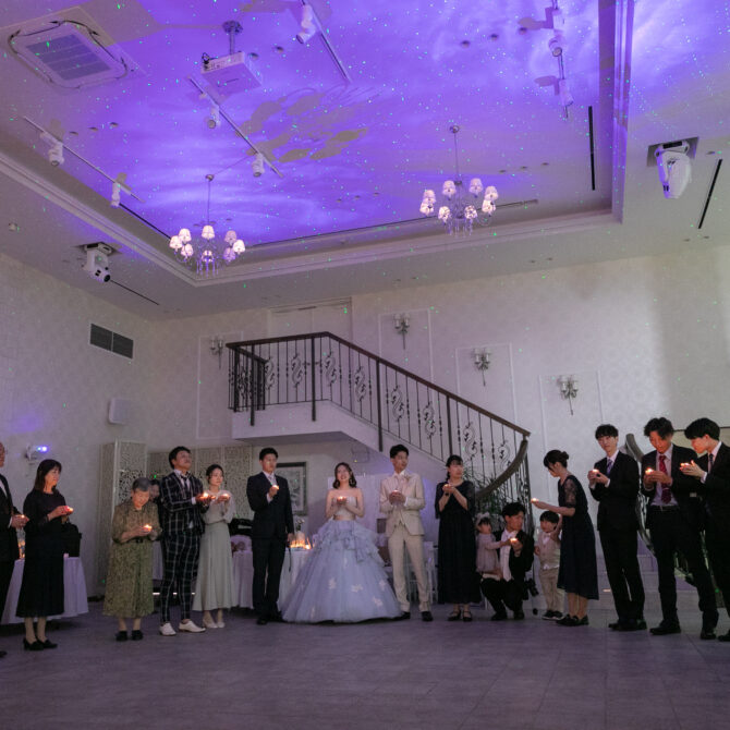 ゆらめく灯りには、これまでの感謝と、これからの幸せへの願いが込められています。 そして、司会者の 「皆様との大切なご縁がこれからもずっと続きますように。ここにいる全員の幸せを願って——」 という言葉に合わせて、そっと灯りを吹き消しました。会場は温かな余韻とともに、優しい光の記憶で包まれました。