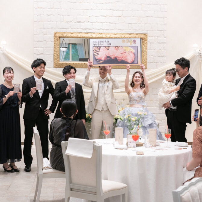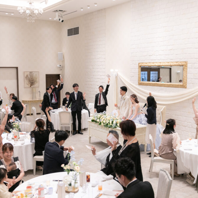 新郎様手作りの抽選器を回し、新郎様が「11番!」と読み上げた瞬間、なんと会場のほとんどの方がビンゴに!ところが、ビンゴにならなかった方こそが“真のラッキー賞”の対象というサプライズ展開✨