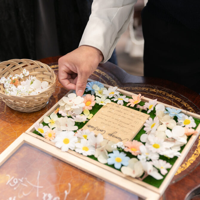 おふたりの挙式は、これまで支えてくださった大切な皆さまに見守られながら行われました。ゲストの皆さんと一緒に創り上げる“人前式”として、笑顔と温かさに包まれた素敵な時間に。