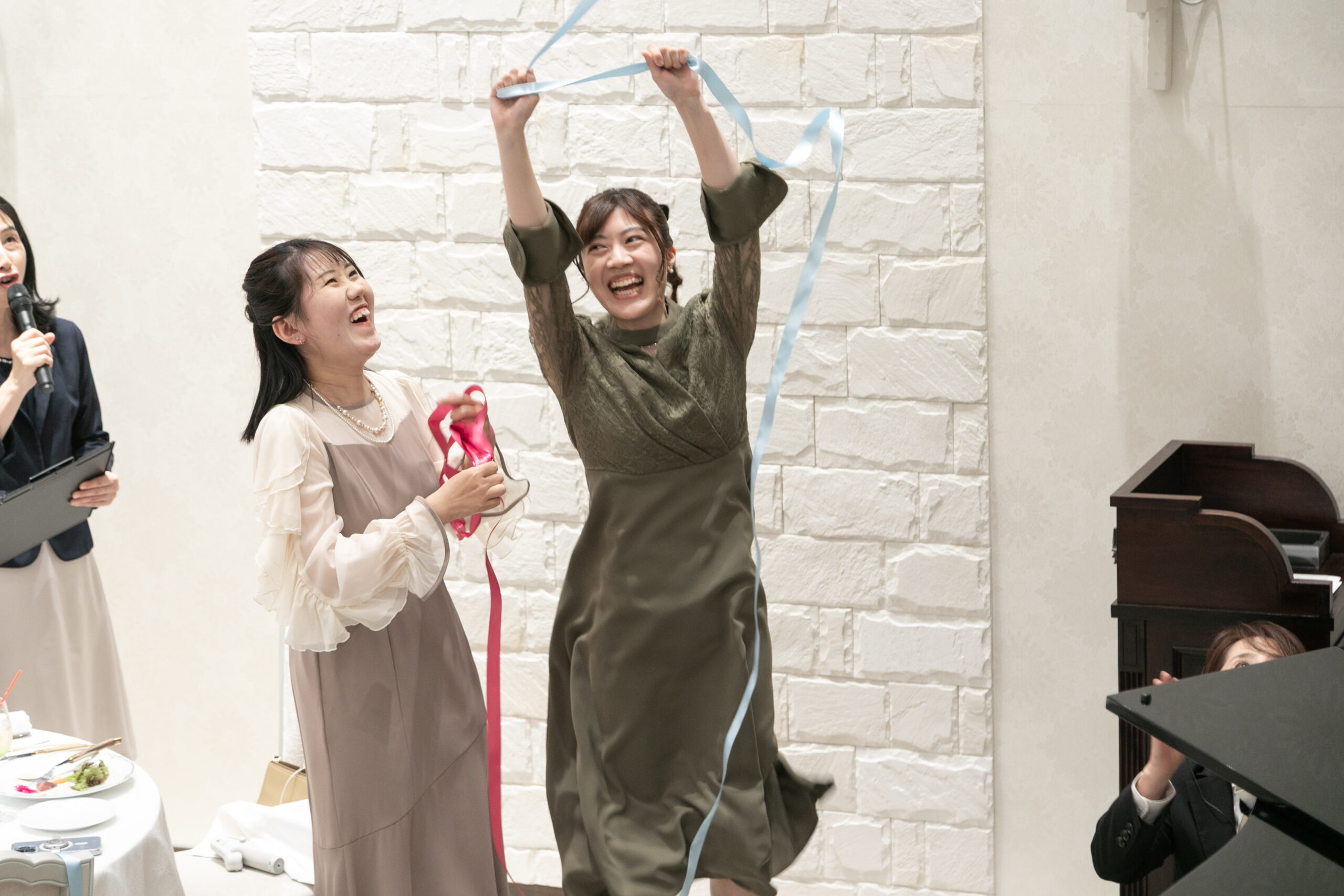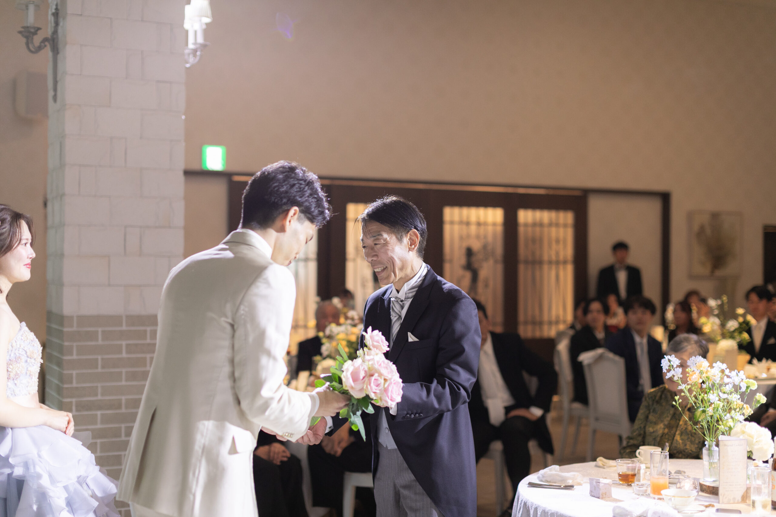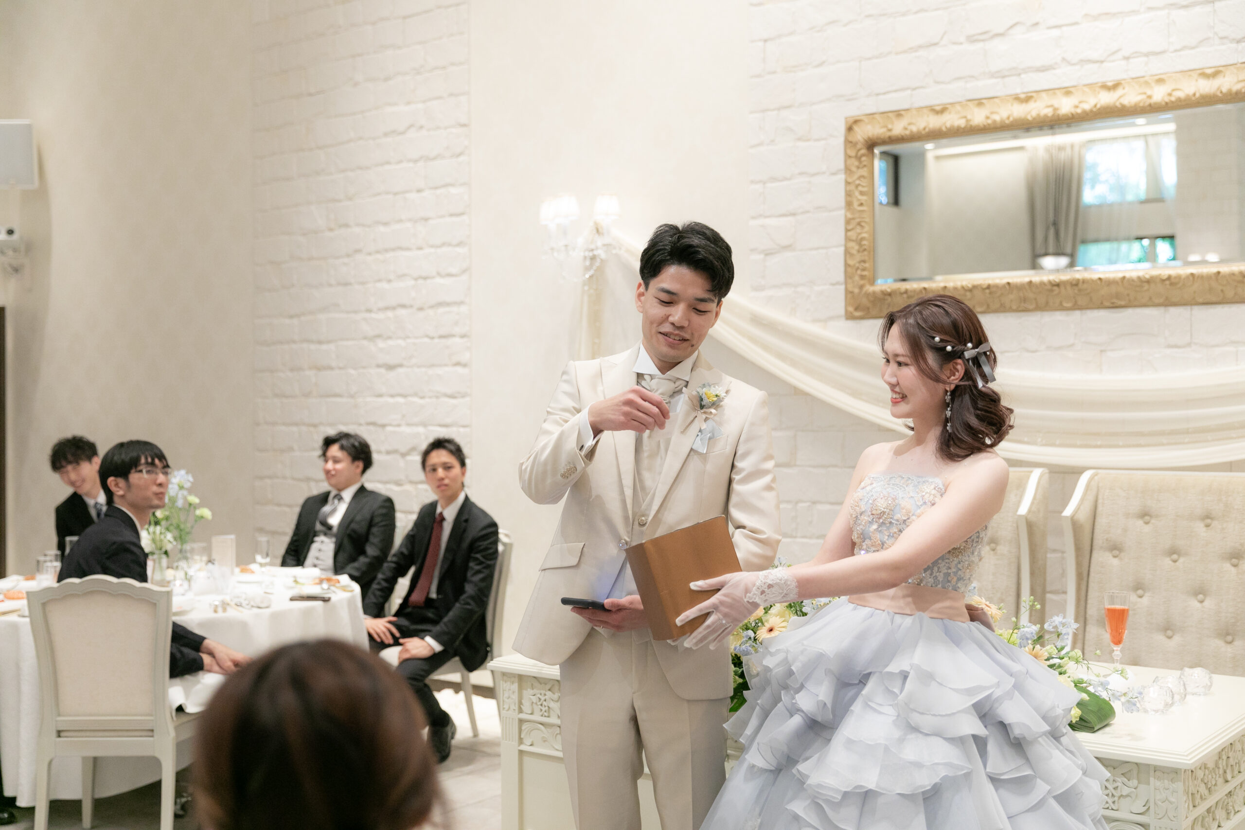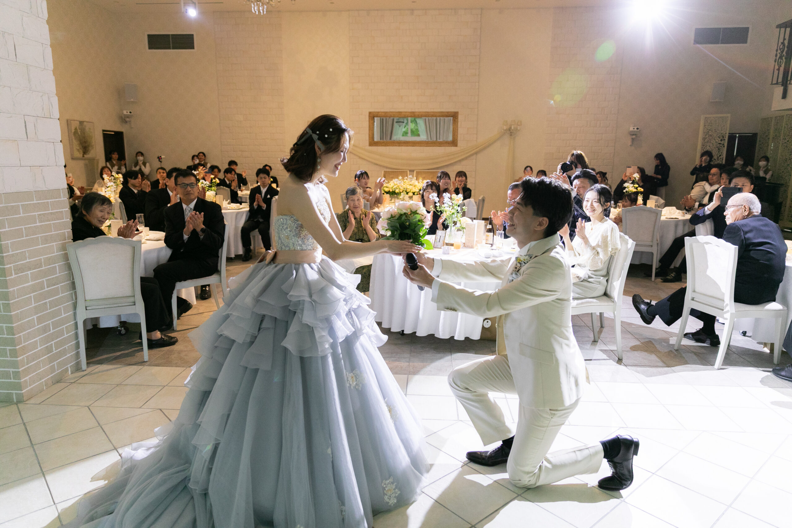 突然のサプライズに驚きながらも、思わず笑みがこぼれる新婦様。会場はあたたかい拍手と祝福に包まれ、おふたりの愛がより深く、鮮やかに輝いたひとときとなりました。