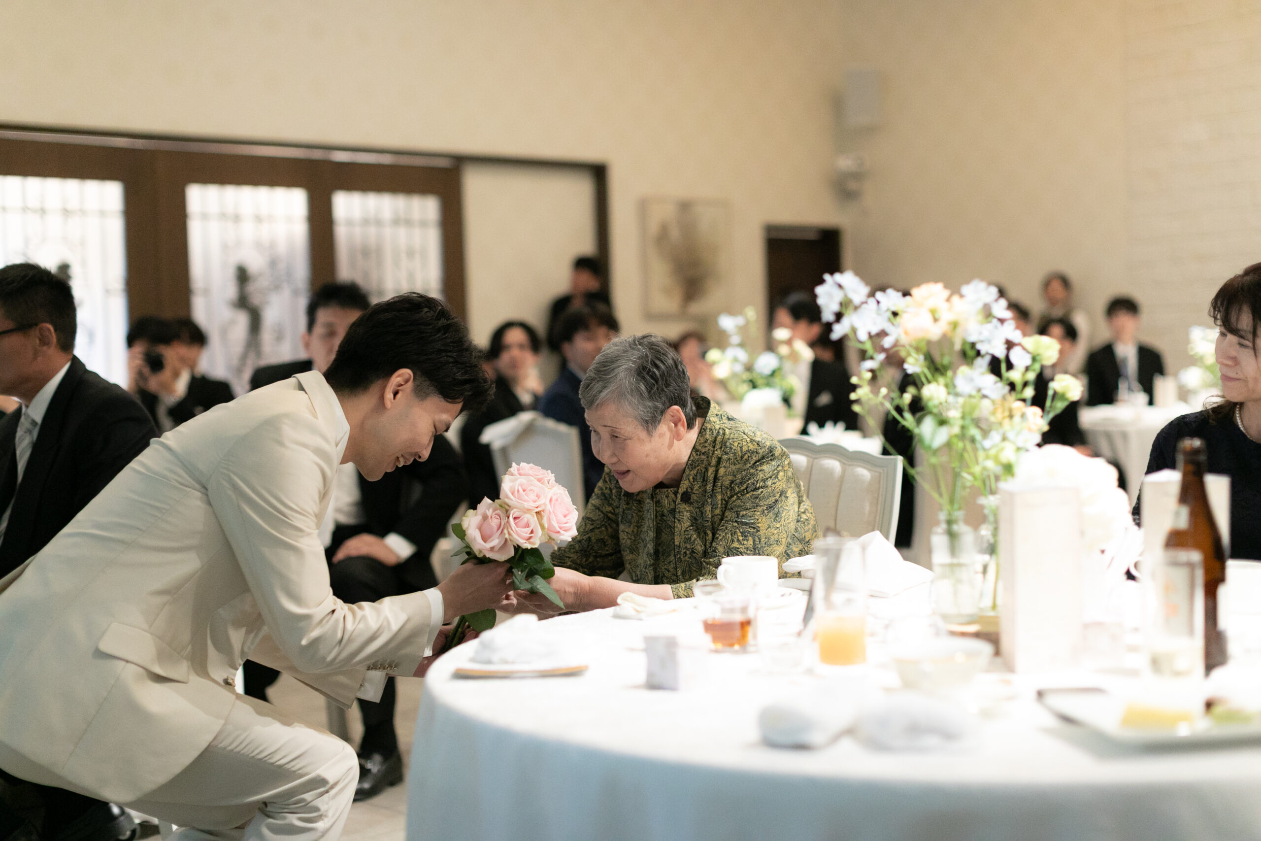 新郎様は、会場にいる12名のゲストの方から一輪ずつバラを受け取りながら、新婦様のもとへゆっくりと歩みを進めます。