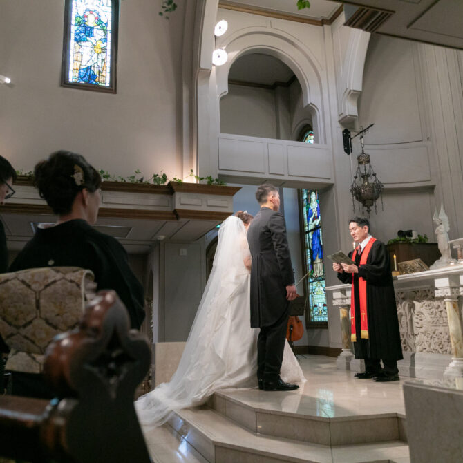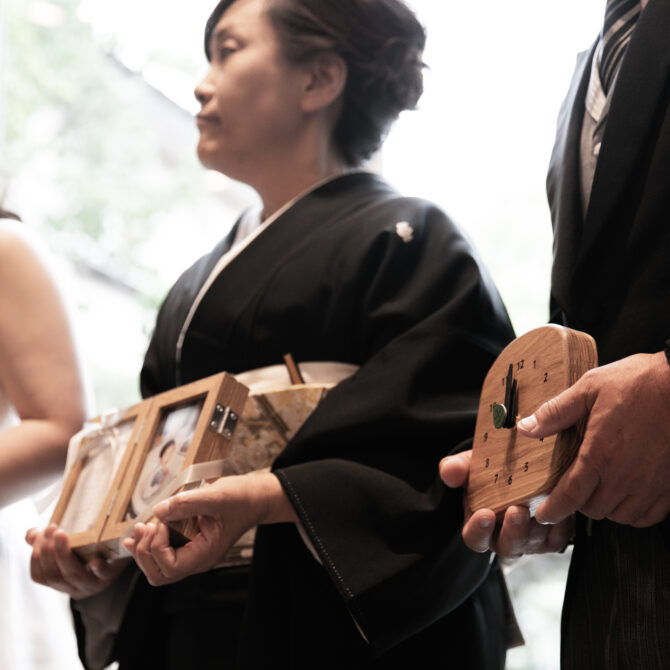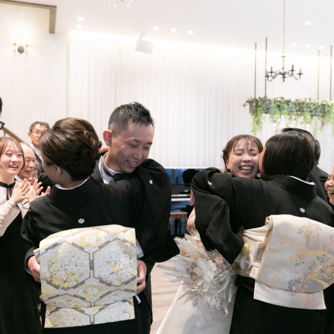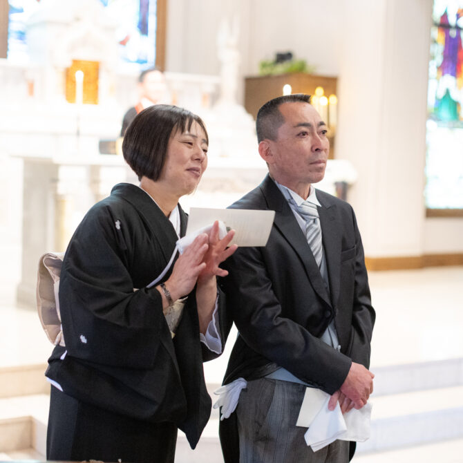 挙式では、ご家族に見守られる中で無事に誓いを交わされました。おふたりだけでなく、親御様も胸に込み上げるものがあり、これまでの歩みを思い返しながら心温まる時間となりました。