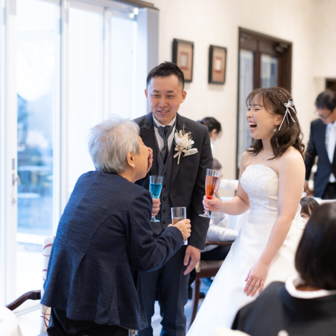 挙式後はプレパーティのお時間へ。お席には、おふたりが用意された写真付きメッセージカードが並び、ゲスト同士がカードを見せ合って盛り上がる姿も。また、ゲームやフィンガーフードを通して両家の交流も深まり、会場は一気にアットホームな雰囲気に包まれました。そんな和やかな空気の中、ヘアチェンジをされた真子さんと翔太さんが再登場!ご挨拶と乾杯の後は、ゲスト全員の自己紹介へ。温かいコメントや、おふたりの幼い頃のエピソードも飛び出し、笑顔あふれるひとときとなりました。