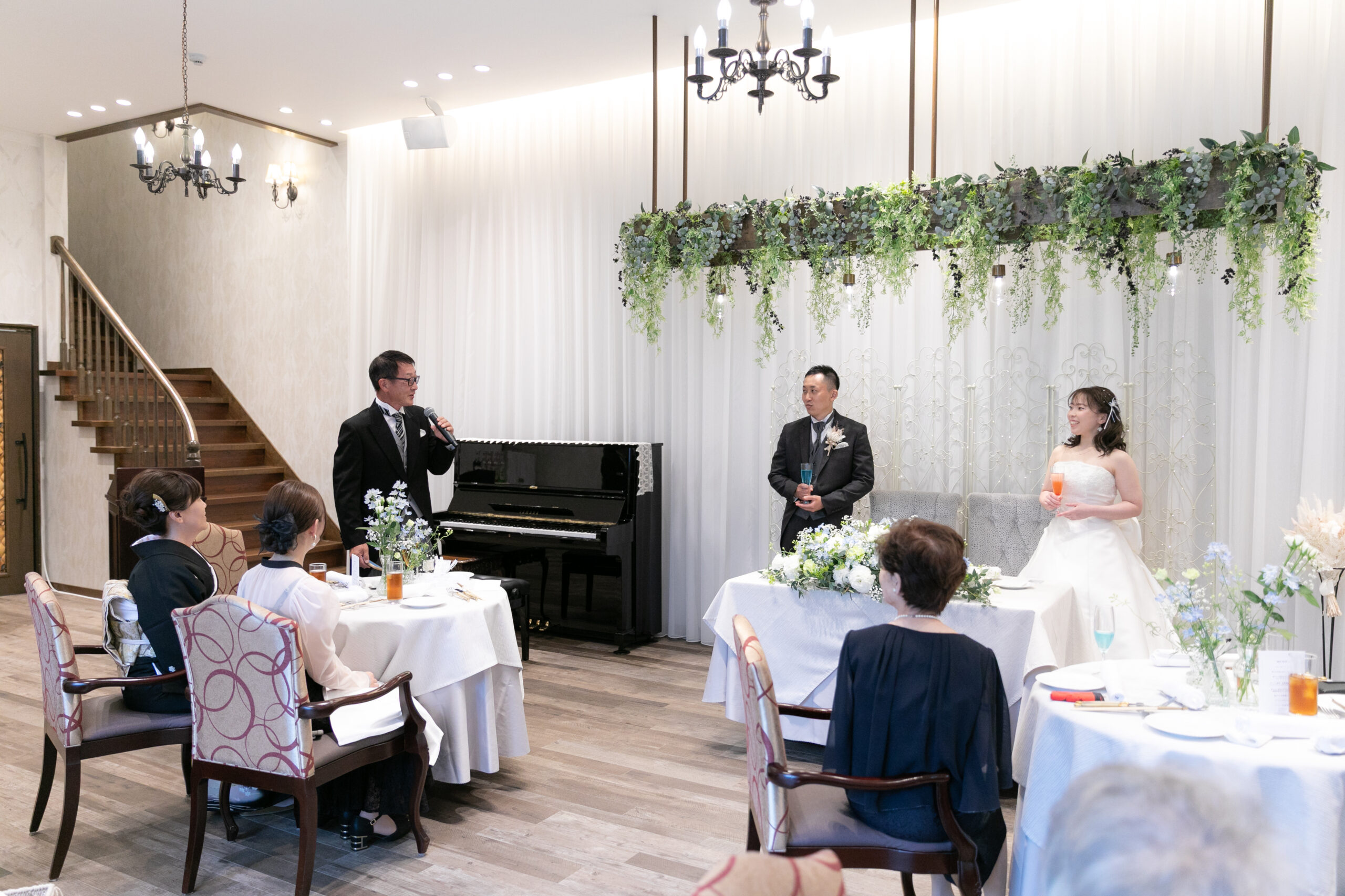 挙式後はプレパーティのお時間へ。お席には、おふたりが用意された写真付きメッセージカードが並び、ゲスト同士がカードを見せ合って盛り上がる姿も。また、ゲームやフィンガーフードを通して両家の交流も深まり、会場は一気にアットホームな雰囲気に包まれました。そんな和やかな空気の中、ヘアチェンジをされた真子さんと翔太さんが再登場!ご挨拶と乾杯の後は、ゲスト全員の自己紹介へ。温かいコメントや、おふたりの幼い頃のエピソードも飛び出し、笑顔あふれるひとときとなりました。