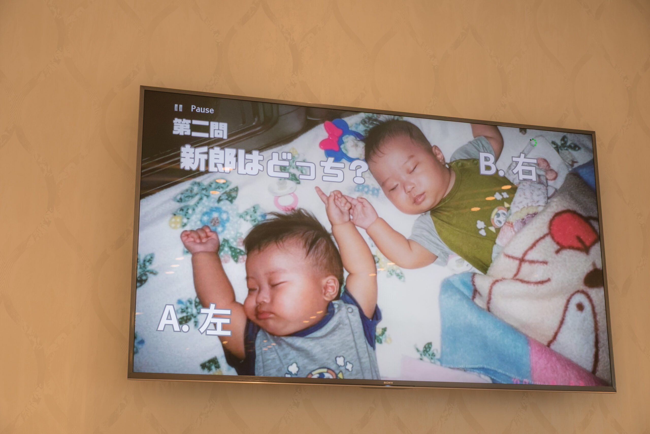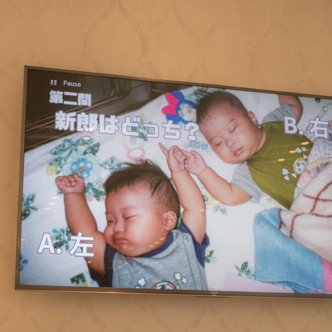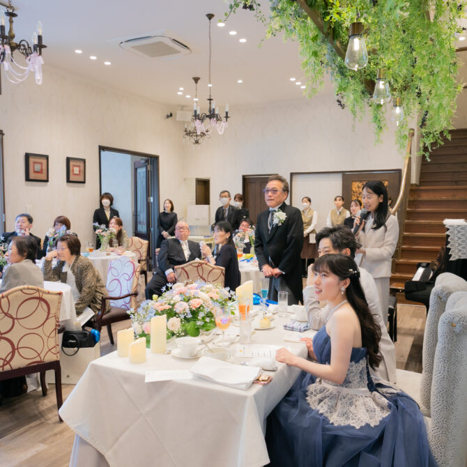 そして、おふたりが楽しみにされていた演出のひとつが、テーブル対抗の「新郎新婦クイズ」。正解したチームには豪華景品が用意されていたこともあり、皆さま真剣に、そして笑顔いっぱいで参加してくださいました。最初の問題は、双子の弟様がいらっしゃる健太さんに関するクイズ。懐かしいお写真を眺めながらご両親が答えていく姿に、会場も温かい雰囲気に包まれます。さらに真彩さんのお父様は、健太さんのご両親にヒントをもらおうとたくさんお話をされ、和やかな交流の場にもなりました。両家のゲストが一緒に力を合わせて楽しんだクイズは、おふたりの思い出を振り返るひとときとなり、心に残る時間となりました。