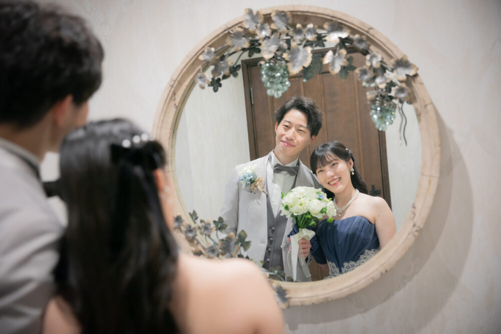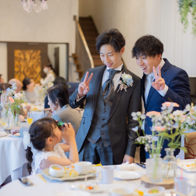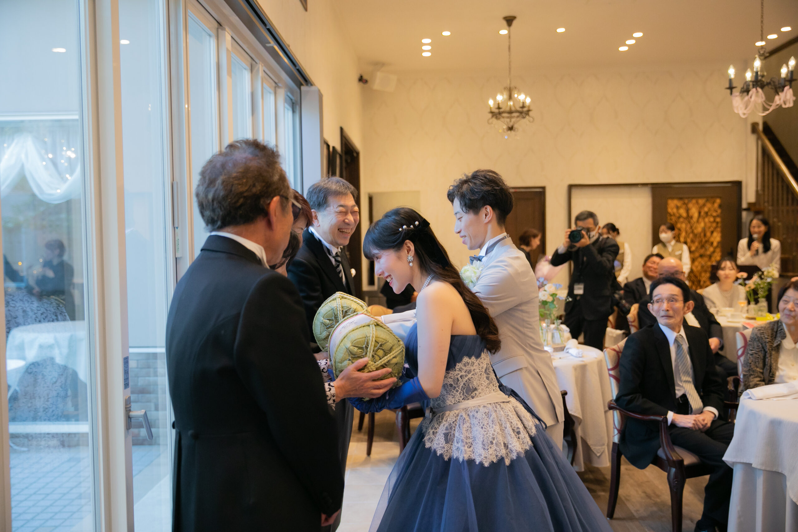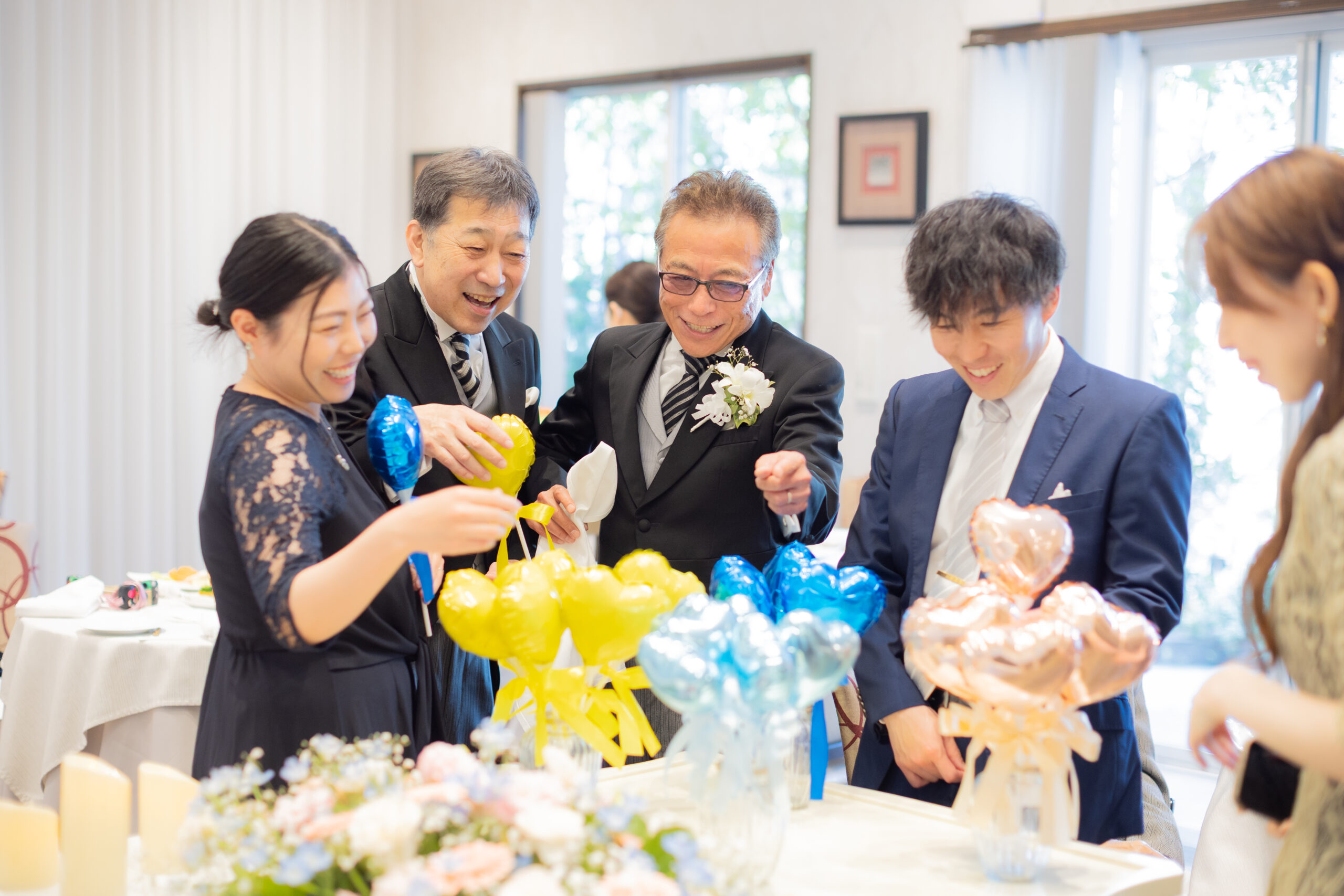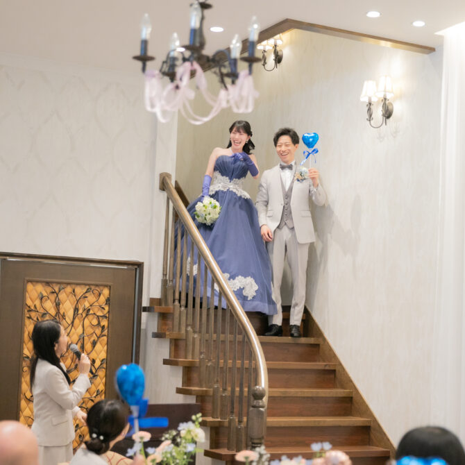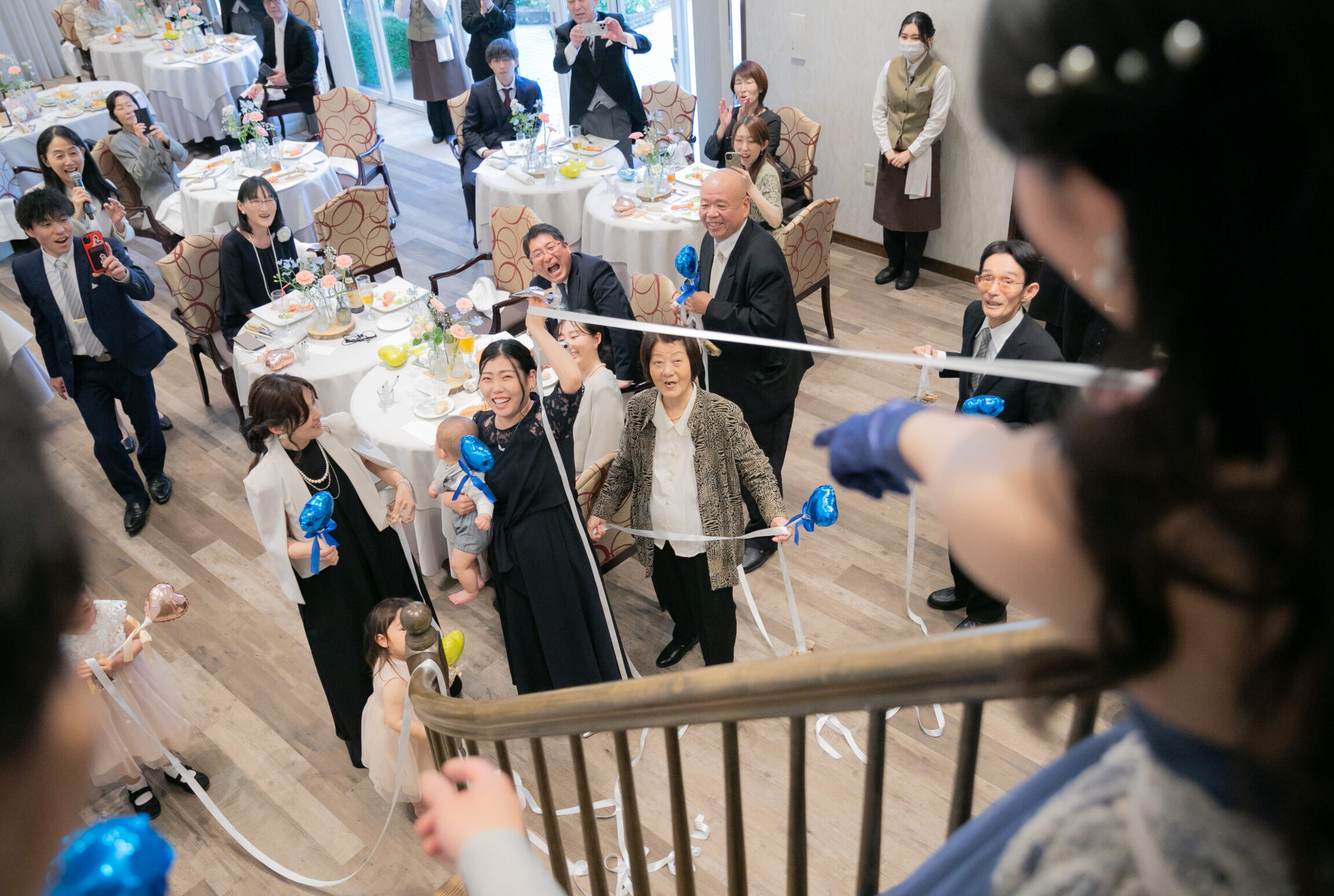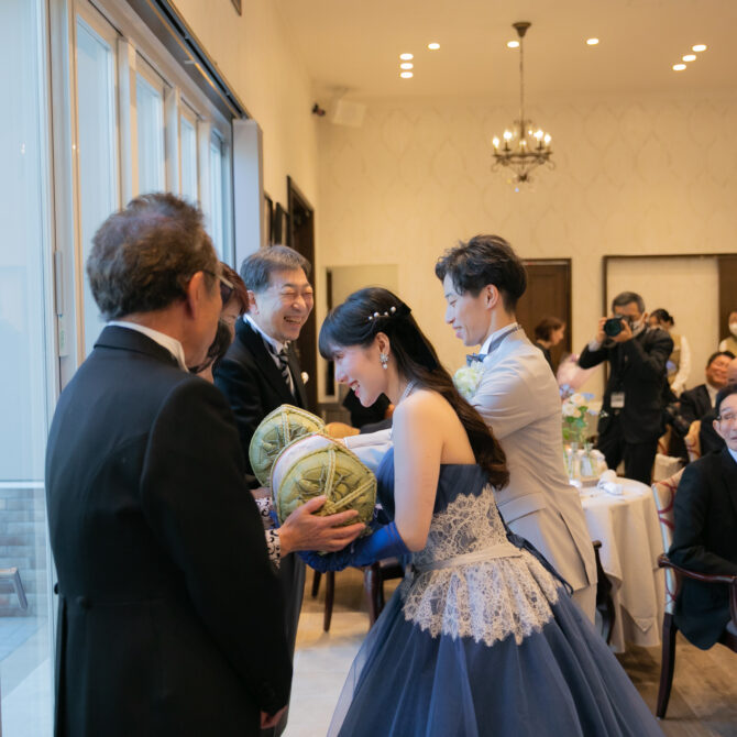 中座のあとは、ゲストの皆さまに向けて、ドレス色当てクイズ!正解のヒントは、色とりどりの風船たち。両家のお父様とご兄弟様が風船を選びに行く姿には、和やかな笑いがこぼれ、どれを選ぼうかと話し合う姿も微笑ましい場面に。そして、ネイビーのドレスに身を包んだ真彩さんと、ベージュのタキシード姿の健太さんが入場されると、風船を振ってゲスト全員で温かくお迎えしました。風船の色が当たったゲストの皆さまにはリボンプルズにご参加いただき、一斉にリボンを引いていただきます。その中で真彩さんと繋がっていたリボンを引き当てたのは、お姉さま。見事ブーケを受け取られ、会場からは大きな拍手が送られました。さらに参加してくださった皆さまのリボンには、可愛いお菓子の参加賞もついており、会場全体が笑顔に包まれました。