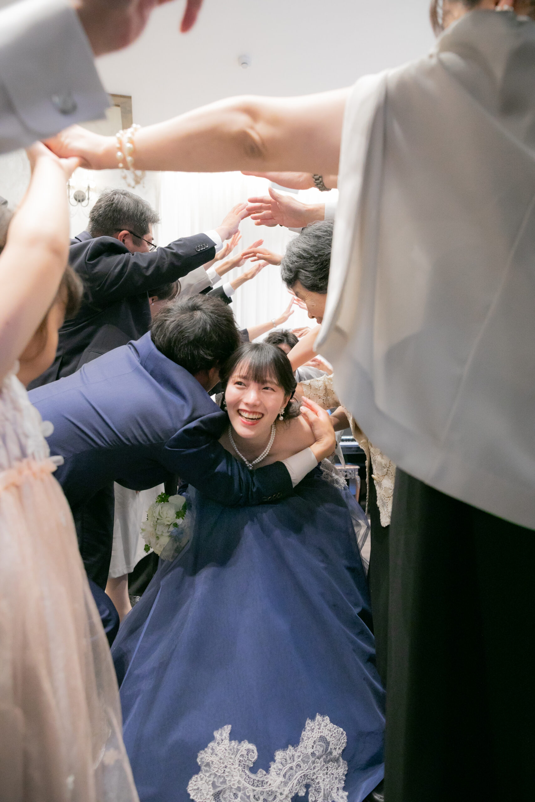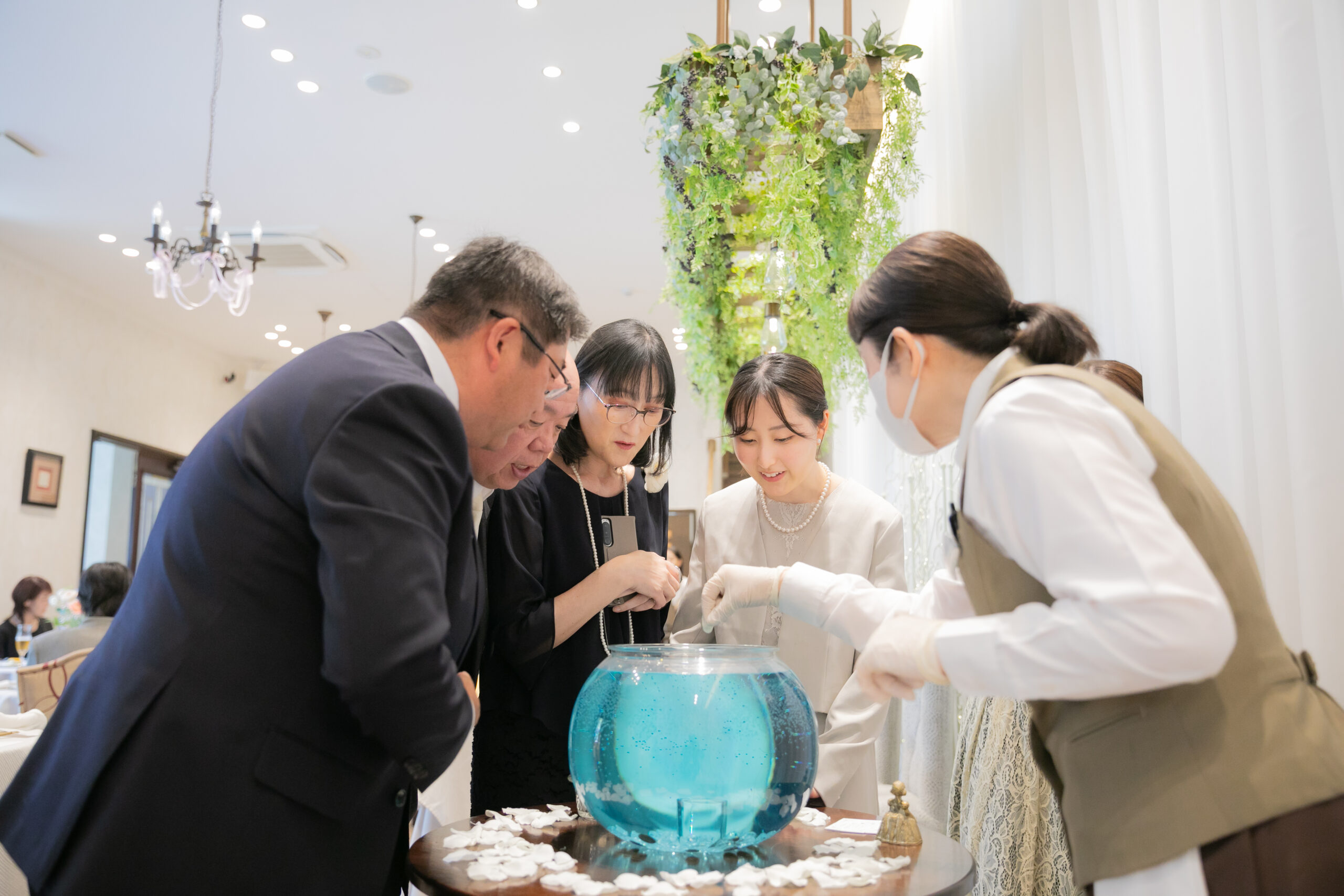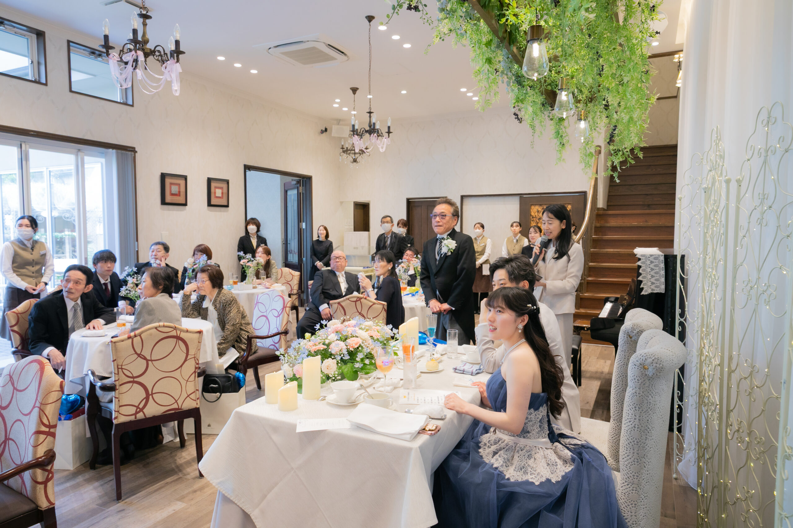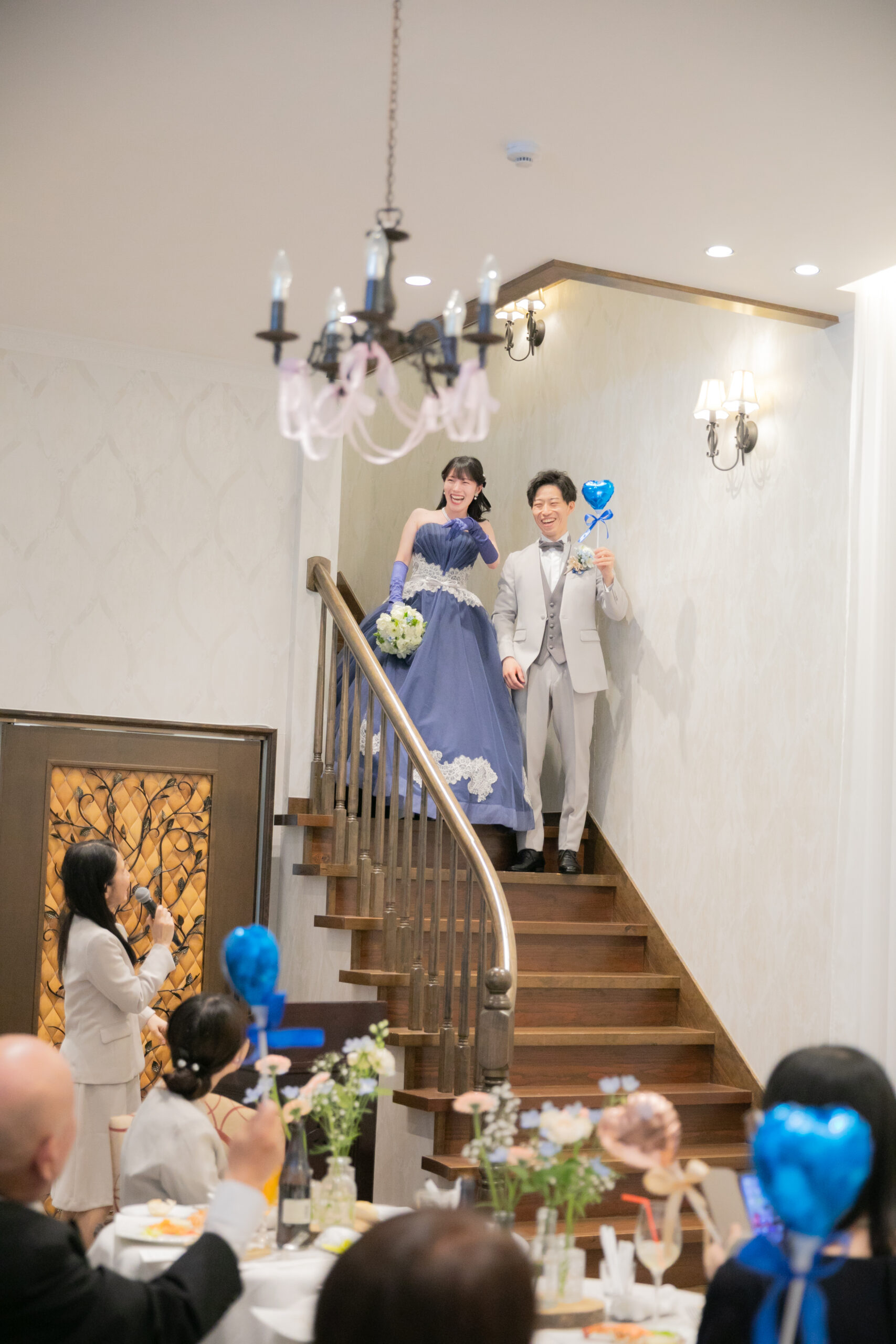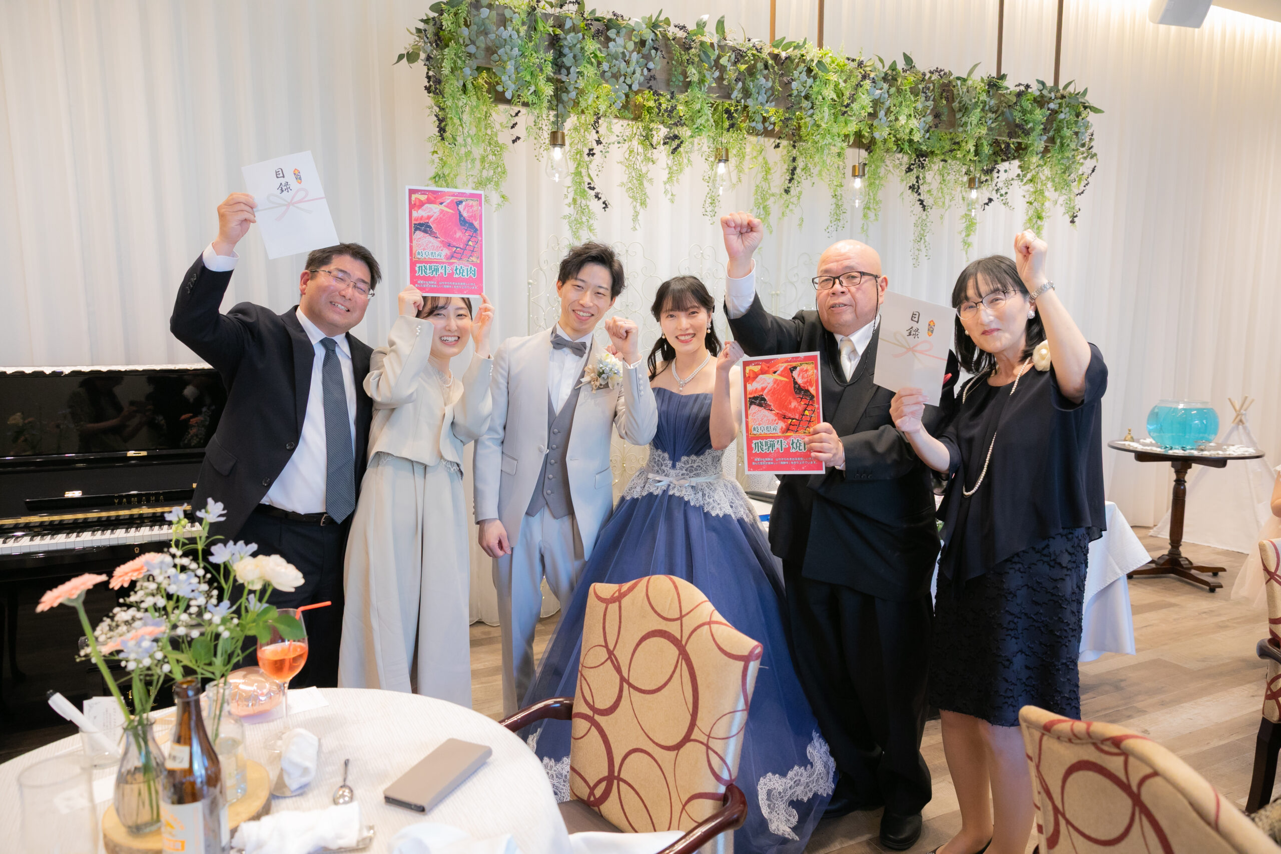 中座のあとは、ゲストの皆さまに向けて、ドレス色当てクイズ!正解のヒントは、色とりどりの風船たち。両家のお父様とご兄弟様が風船を選びに行く姿には、和やかな笑いがこぼれ、どれを選ぼうかと話し合う姿も微笑ましい場面に。そして、ネイビーのドレスに身を包んだ真彩さんと、ベージュのタキシード姿の健太さんが入場されると、風船を振ってゲスト全員で温かくお迎えしました。風船の色が当たったゲストの皆さまにはリボンプルズにご参加いただき、一斉にリボンを引いていただきます。その中で真彩さんと繋がっていたリボンを引き当てたのは、お姉さま。見事ブーケを受け取られ、会場からは大きな拍手が送られました。さらに参加してくださった皆さまのリボンには、可愛いお菓子の参加賞もついており、会場全体が笑顔に包まれました。