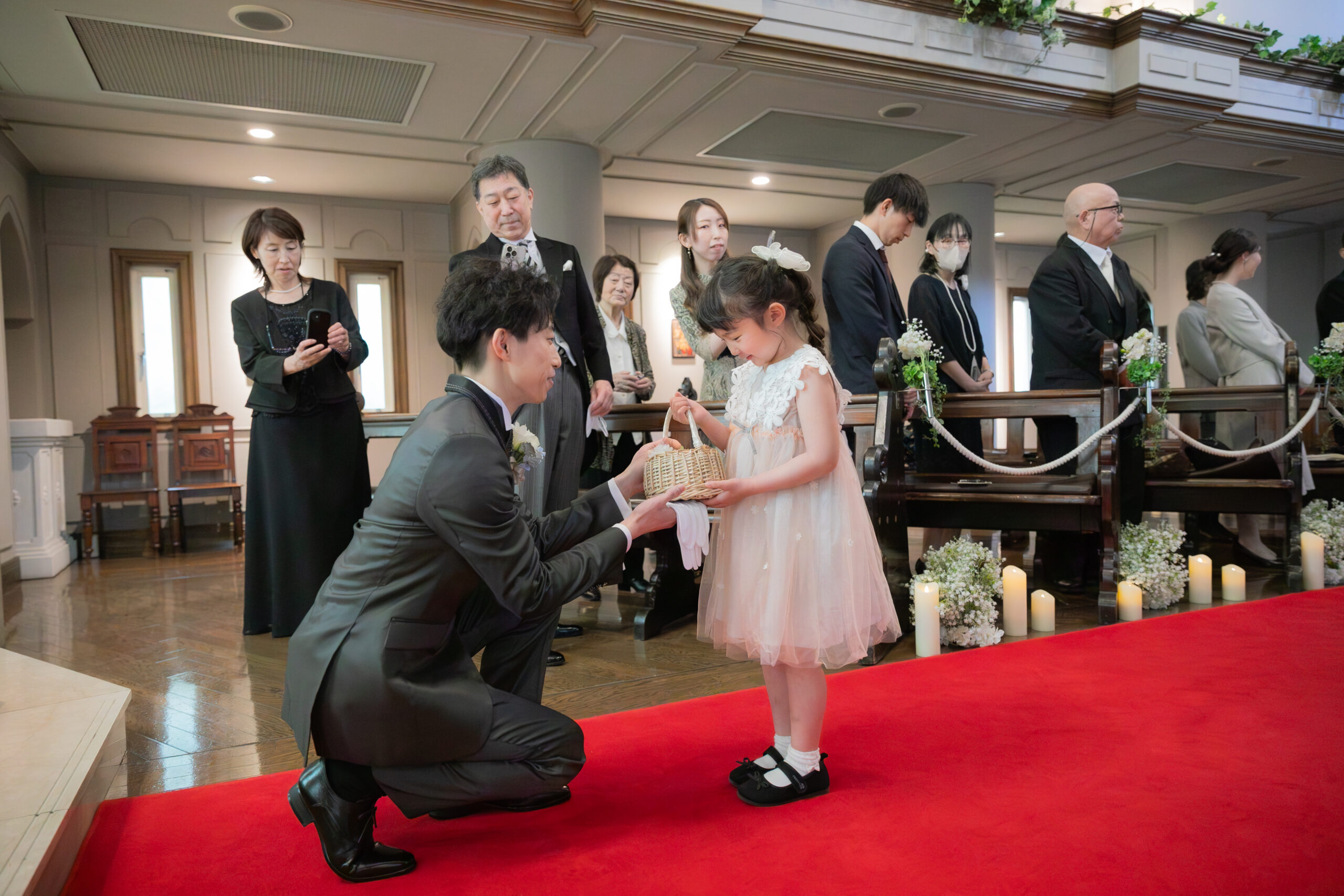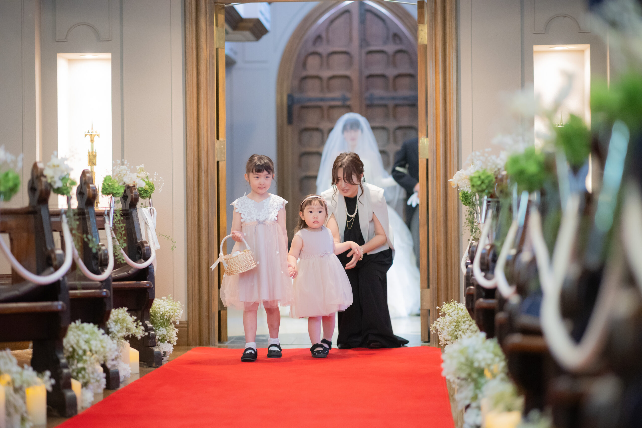挙式前のひとときは、おふたりだけの特別な時間。向かい合った瞬間に自然とこぼれる笑顔が印象的で、ご家族にもそのお姿を見ていただきました。温かな眼差しに包まれたその時間は、ご家族の仲の良さやおふたりの人柄が感じられる、まさに笑顔あふれるひとときとなりました。挙式では、真彩さんの姪っ子ちゃんたちがリングガールを務めてくれました。お姉ちゃんが妹の手をしっかりと握りながら、リングピローとともに健太さんの元へと届けてくれる微笑ましい姿に、会場も思わずほっこり。妹ちゃんは少し驚いてしまいましたが、姉妹で頑張る姿はたくさんのゲストの心を和ませました。