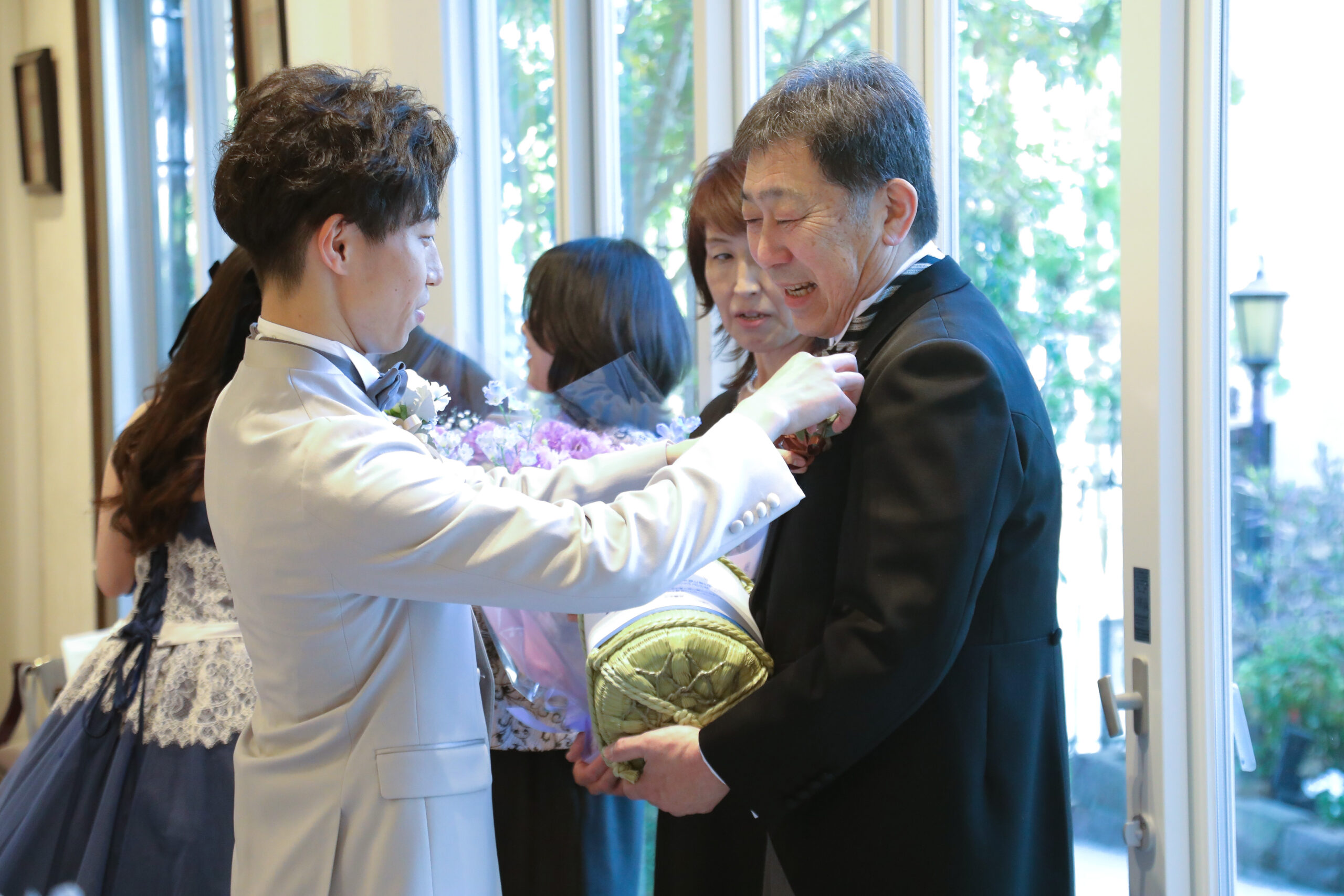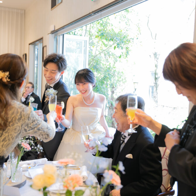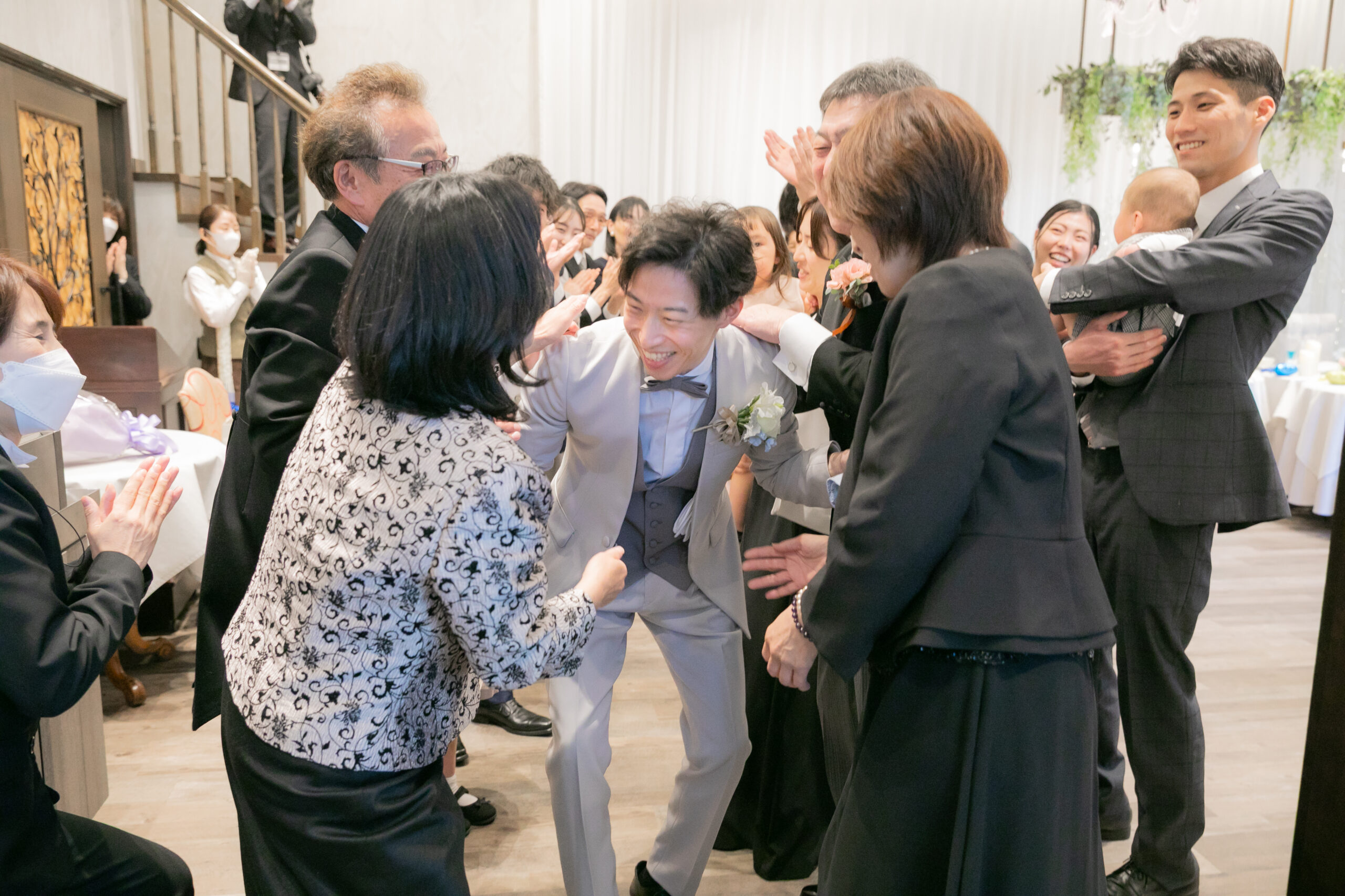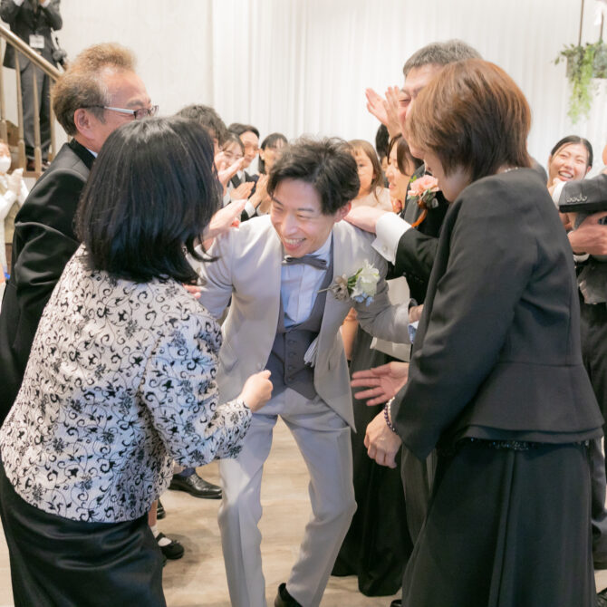 パーティの結びには、おふたりからご両親へ感謝の気持ちを込めて記念品をお渡ししました。ご用意されたのは、生まれたときの体重と同じ重さのお米。まずはお母様へ、生まれた時の感動を思い出していただきその喜びを分かち合うようにお父様へ。そして最後にはお母様へ花束とお父様へコサージュをお渡しされました。ご家族の皆さまが見せてくださった笑顔が、とても温かく印象的でした。退場の際には、ゲストの皆さまが花道を作ってお見送り。ハグやハイタッチでおふたりを心から祝福してくださり、笑顔があふれるフィナーレとなりました。「Enjoy~笑顔のおまじない~」がテーマのおふたりの結婚式は一日を通して、おふたりにとっても、ご家族やゲストの皆さまにとっても、一日中笑顔であふれ、心に残る大切な時間となりました。これからのおふたりの笑顔が絶えない家庭を築いていかれますよう、末永くお幸せに♪