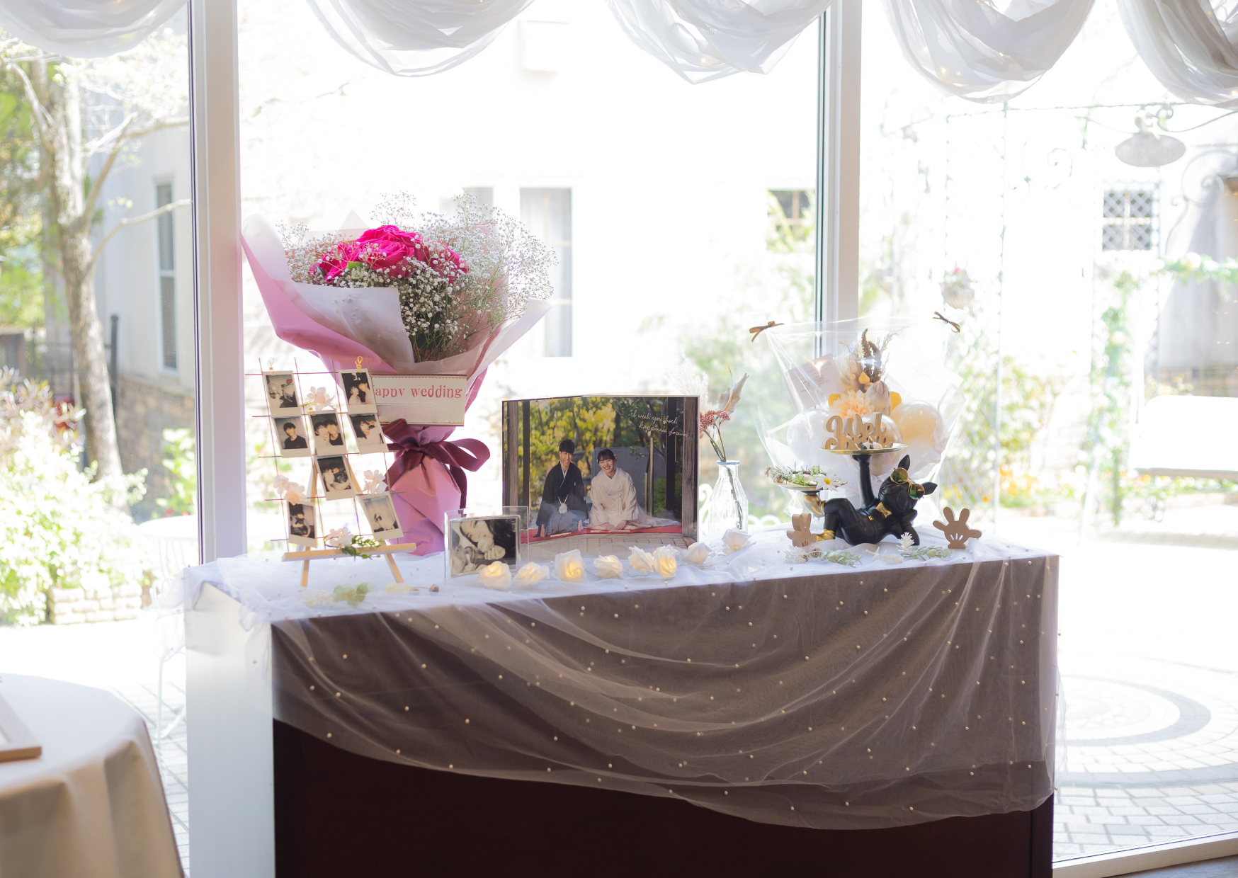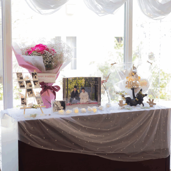 おふたりのテーマは「Enjoy~笑顔のおまじない~」。理想の夫婦像は、“心が和む明るい家庭”。そして「一日一回は大爆笑したい!」という、ふたりらしい温かくて楽しい願いが込められています。そんな思いが詰まった結婚式は、おふたりがこれからもずっと笑い合って過ごしていく未来を、大切な皆さまと一緒に感じられる一日になりますように。そしていつかこの日のことを振り返った時、自然と笑顔があふれ出るそんな幸せの記憶となることを願ってテーマをご提案させて頂きました。結婚式の中に散りばめられた「Enjoy」の言葉が、皆さまにとっても笑顔のおまじないになりました。ウェルカムスペースにはおふたりの思い出のお写真とウェディングツリーの結婚証明書へ皆様からのメッセージを書いていただきました。